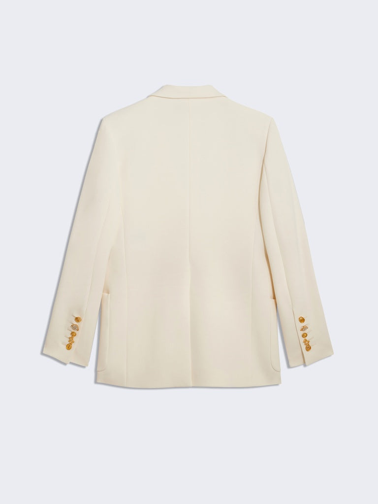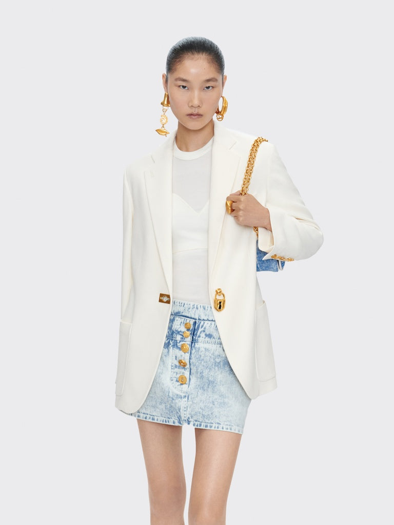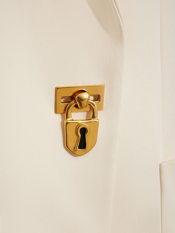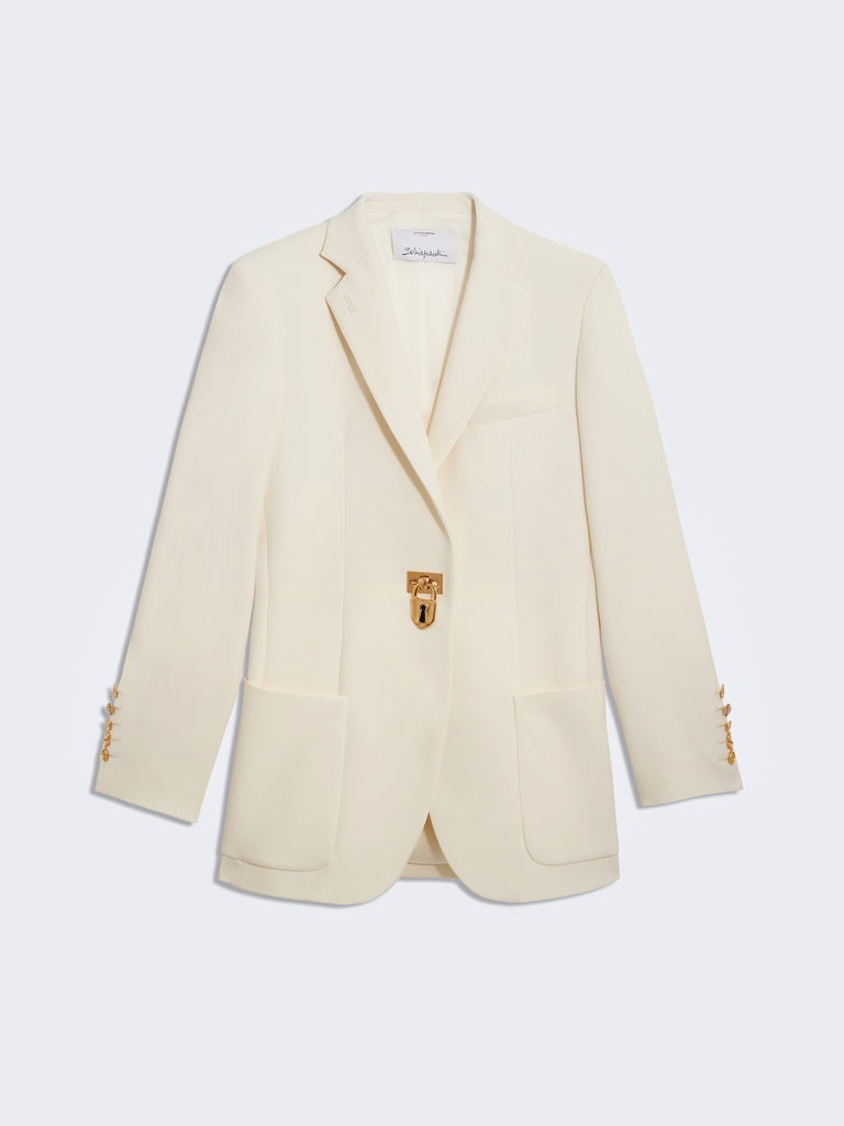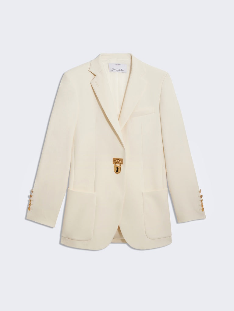 Single-breasted straight blazer in white cady, keyhole motif on the lapel. Gold-tone metal padlock clasp.