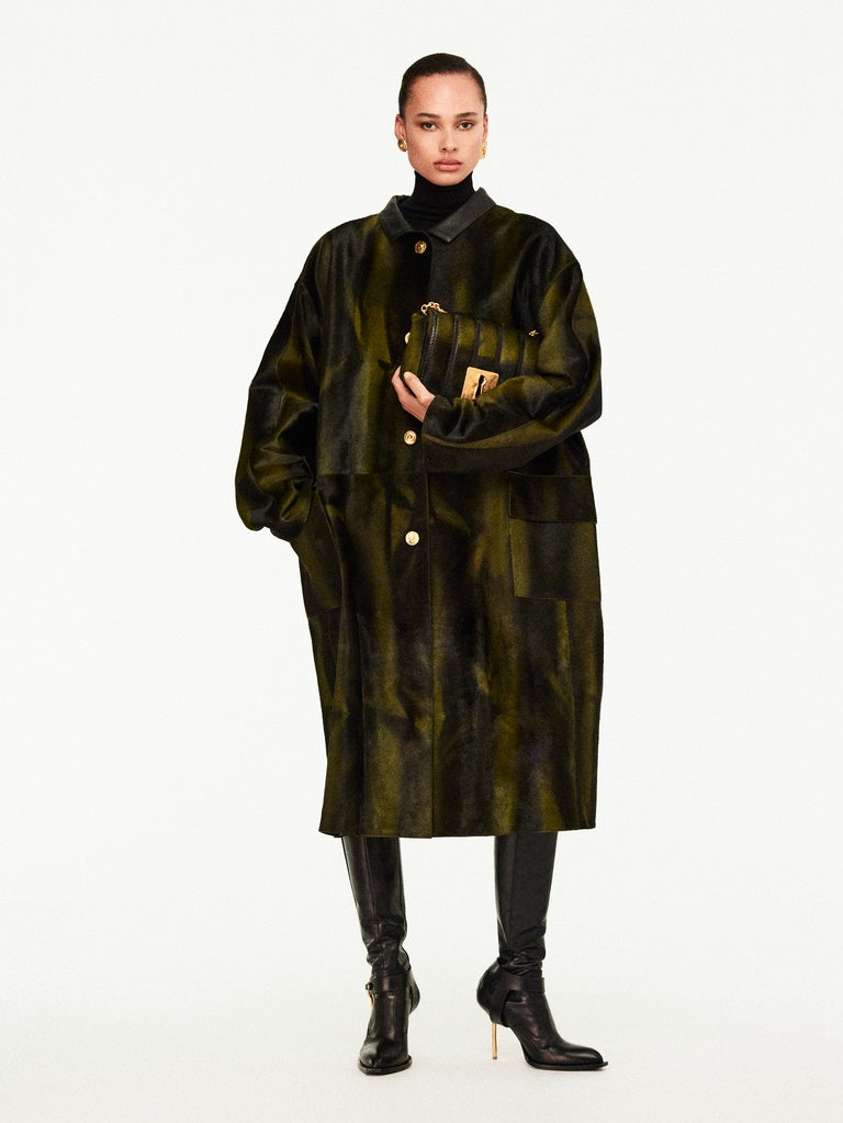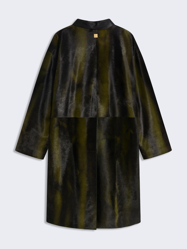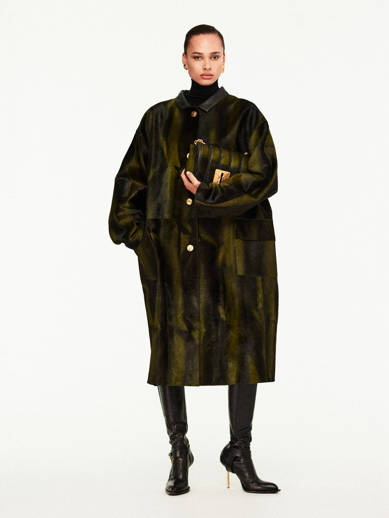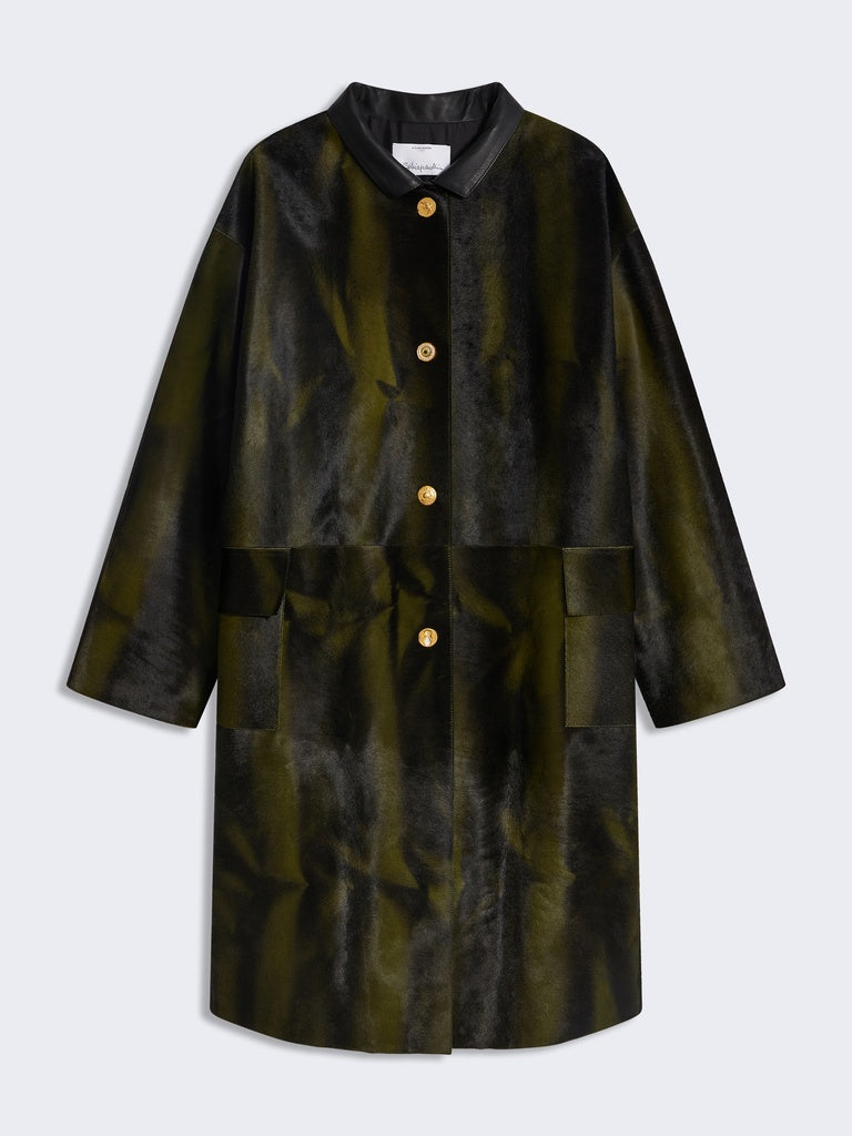 This oversized calfskin coat with a horsehair effect in a dark green and black gradient is enhanced with a stand-up collar and round anatomical snap buttons in gold metal across the entire center front.