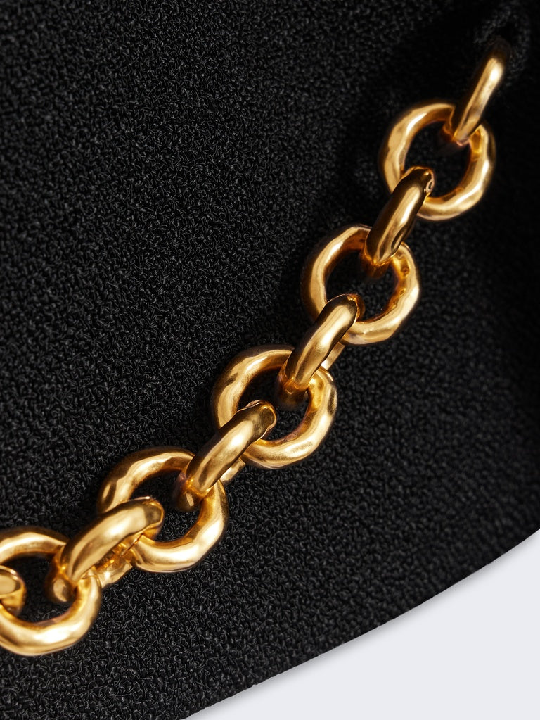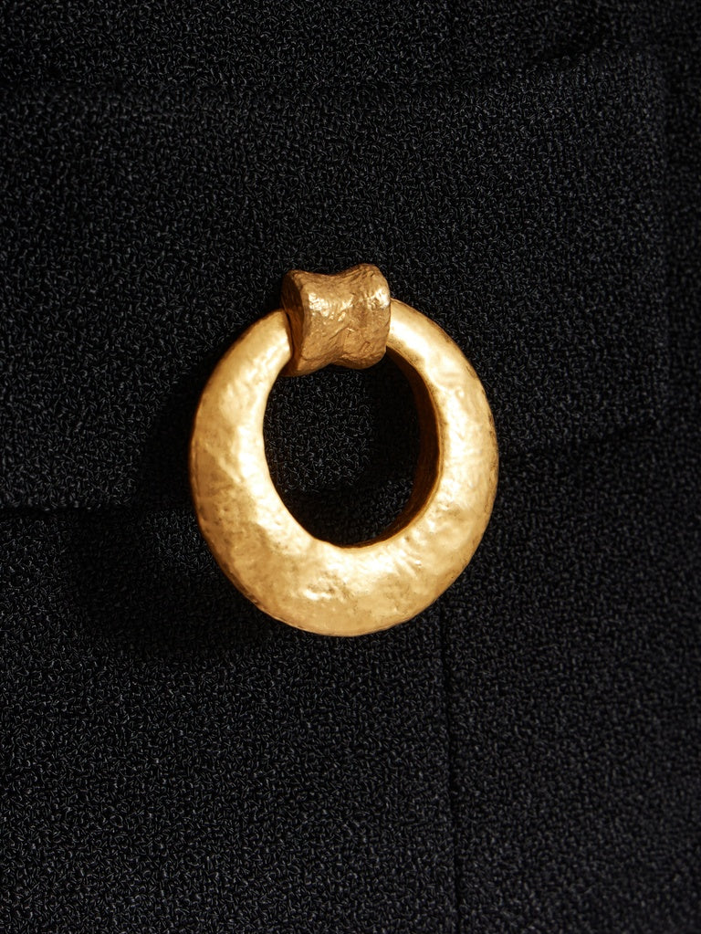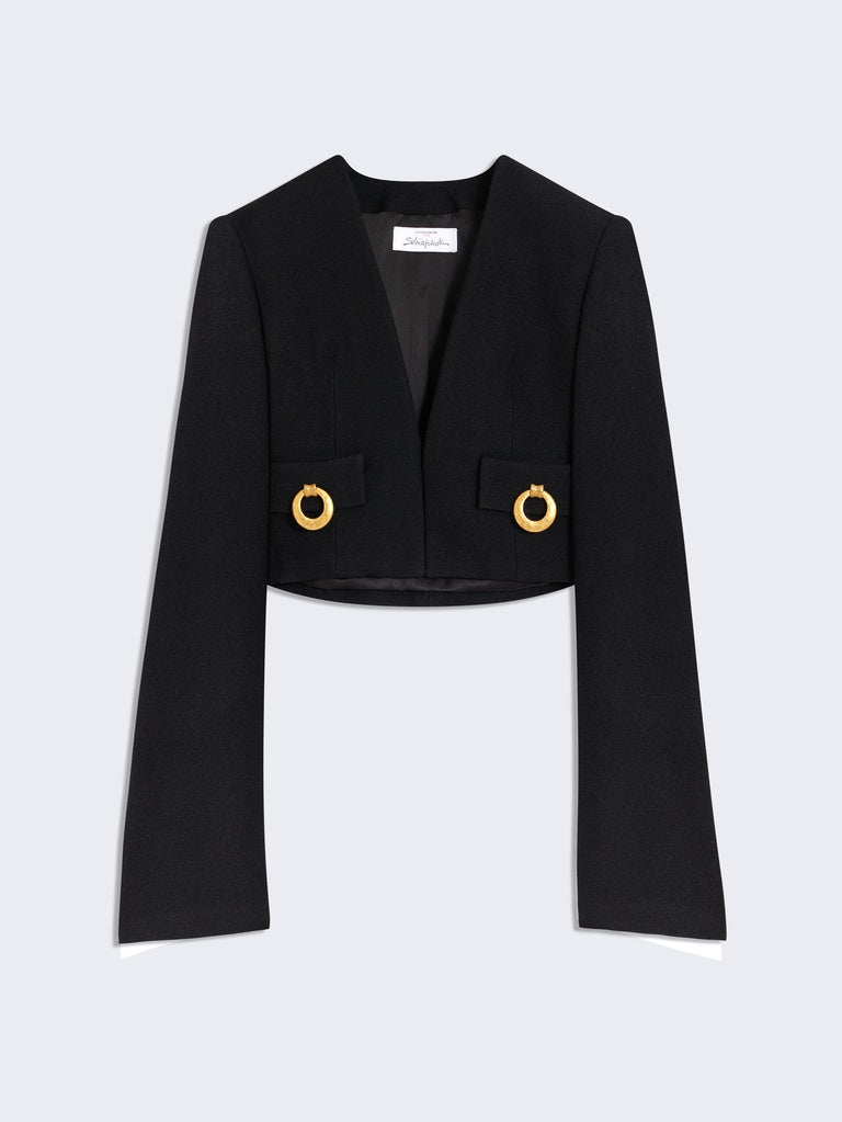 This collarless, square-shouldered jacket is made from textured black viscose. It features flared sleeves and a plunging neckline. It is decorated with trompe-l'œil drawer pockets adorned with gold-tone metal door handles.