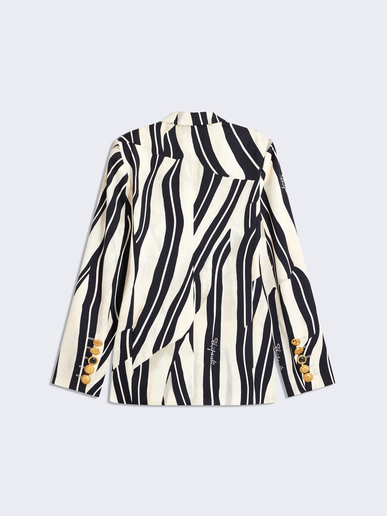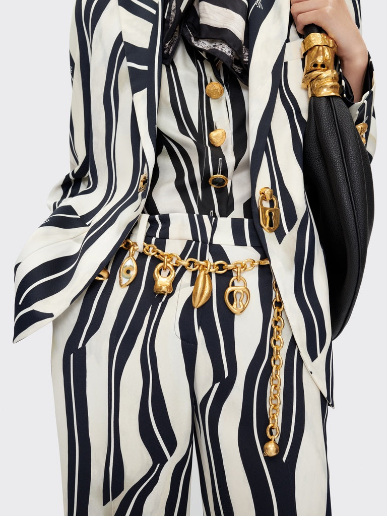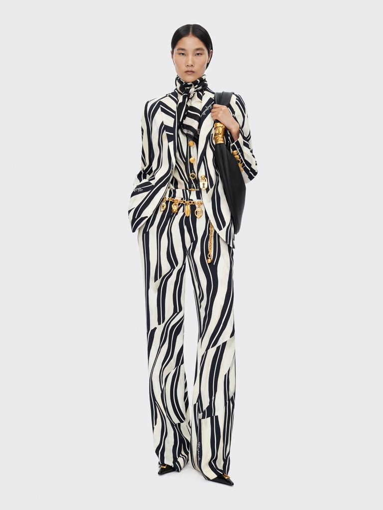 This straight-cut jacket is made from ecru and black brush-print viscose. It is decorated with a signature hammered gold-tone brass padlock clasp and jeweled buttons at the cuffs.