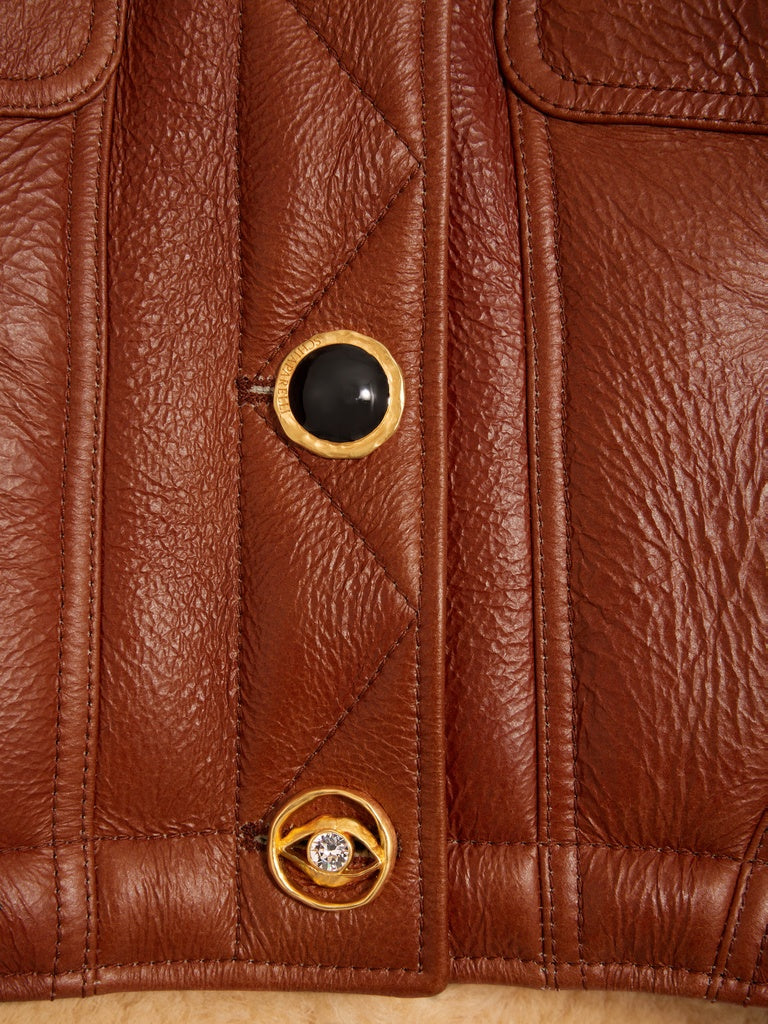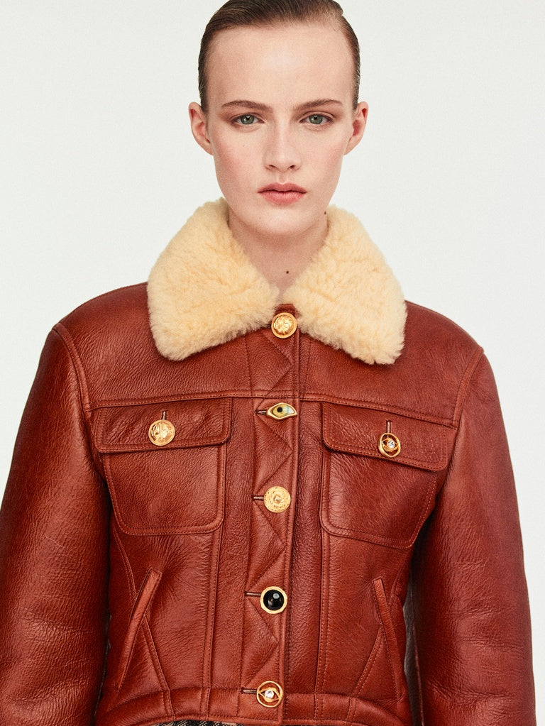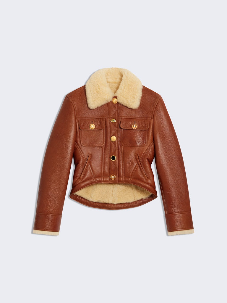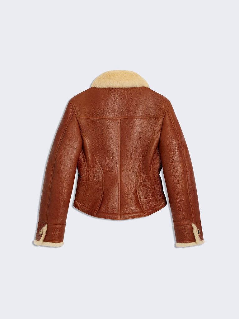 This cognac shearling bomber jacket with an ecru reverse and a fitted cut is enhanced by an asymmetrical, shorter, rounded hem at the front. It is decorated with denim details, gold jewel buttons, and flap chest pockets.