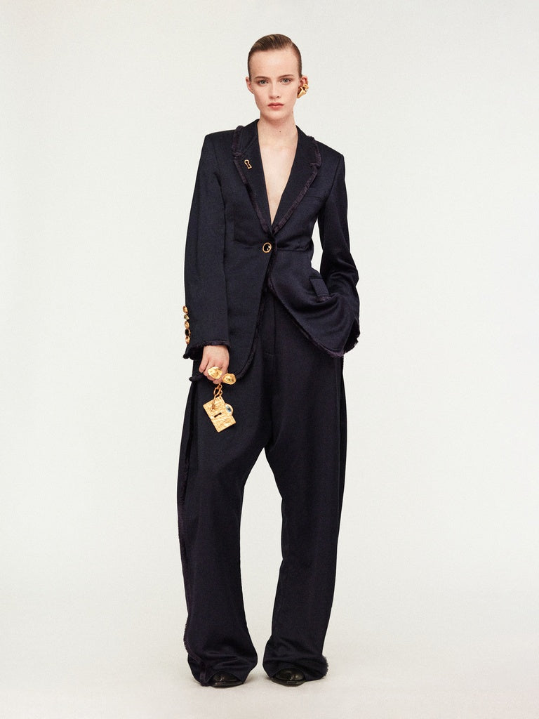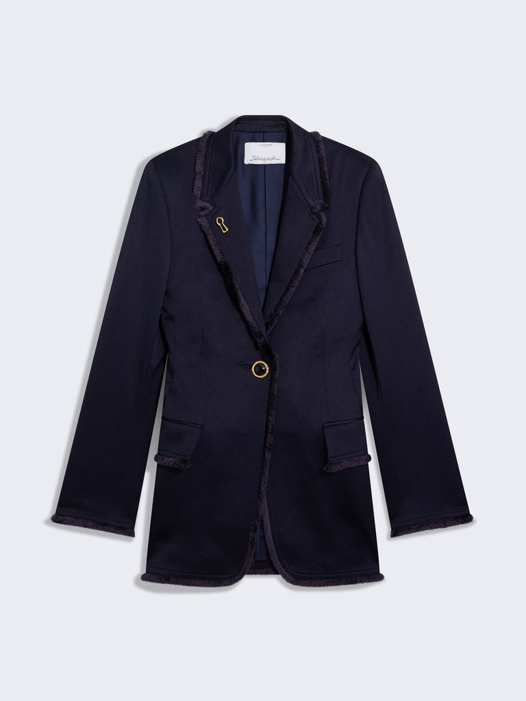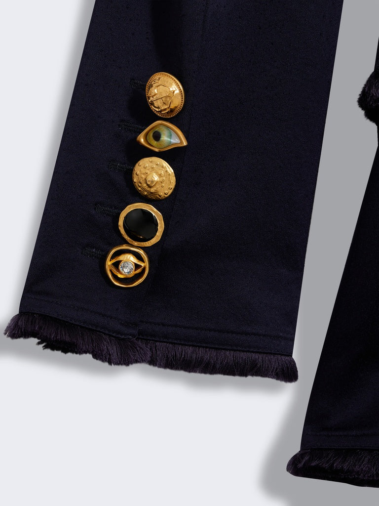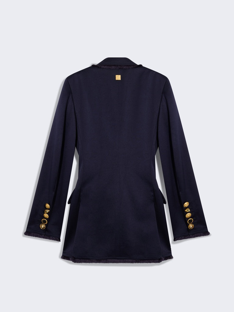 This navy blue textured satin tailored jacket with a straight cut is embellished with gold jewel buttons at the center front and cuffs. It is finished with fringed seams.