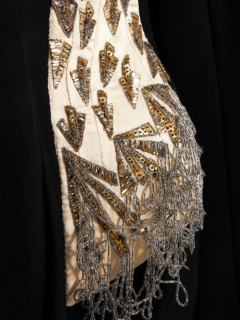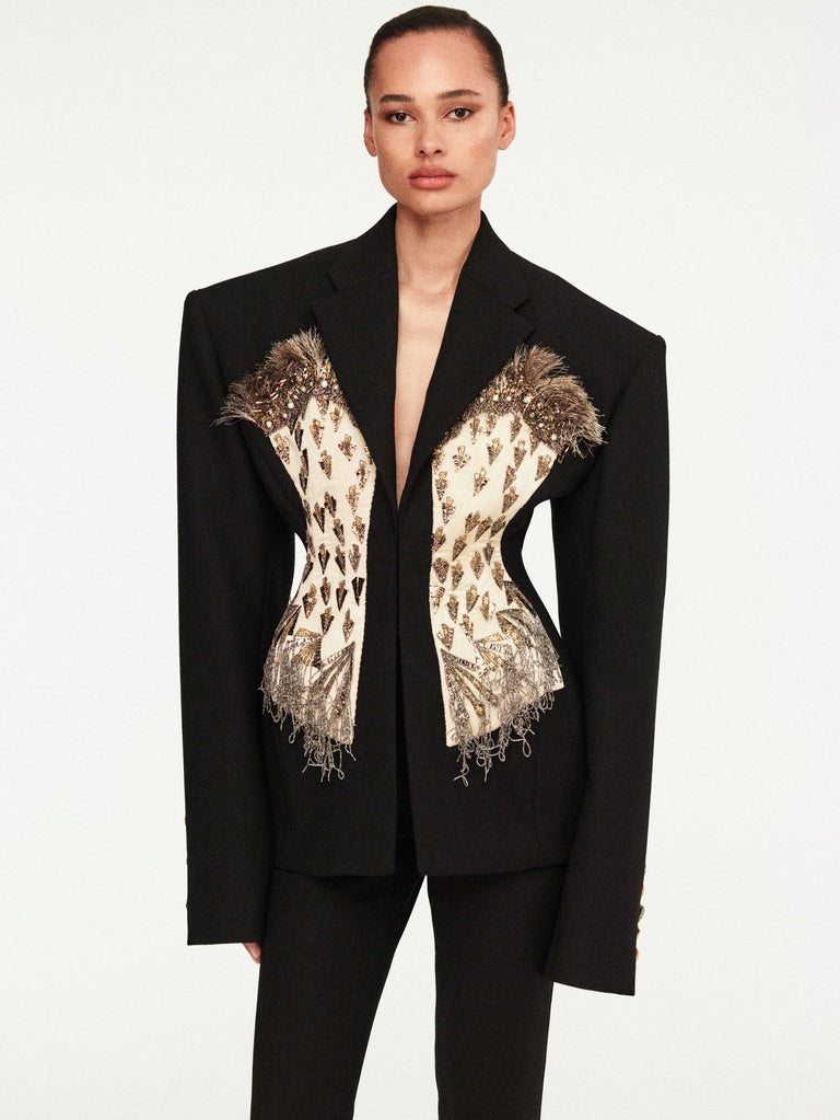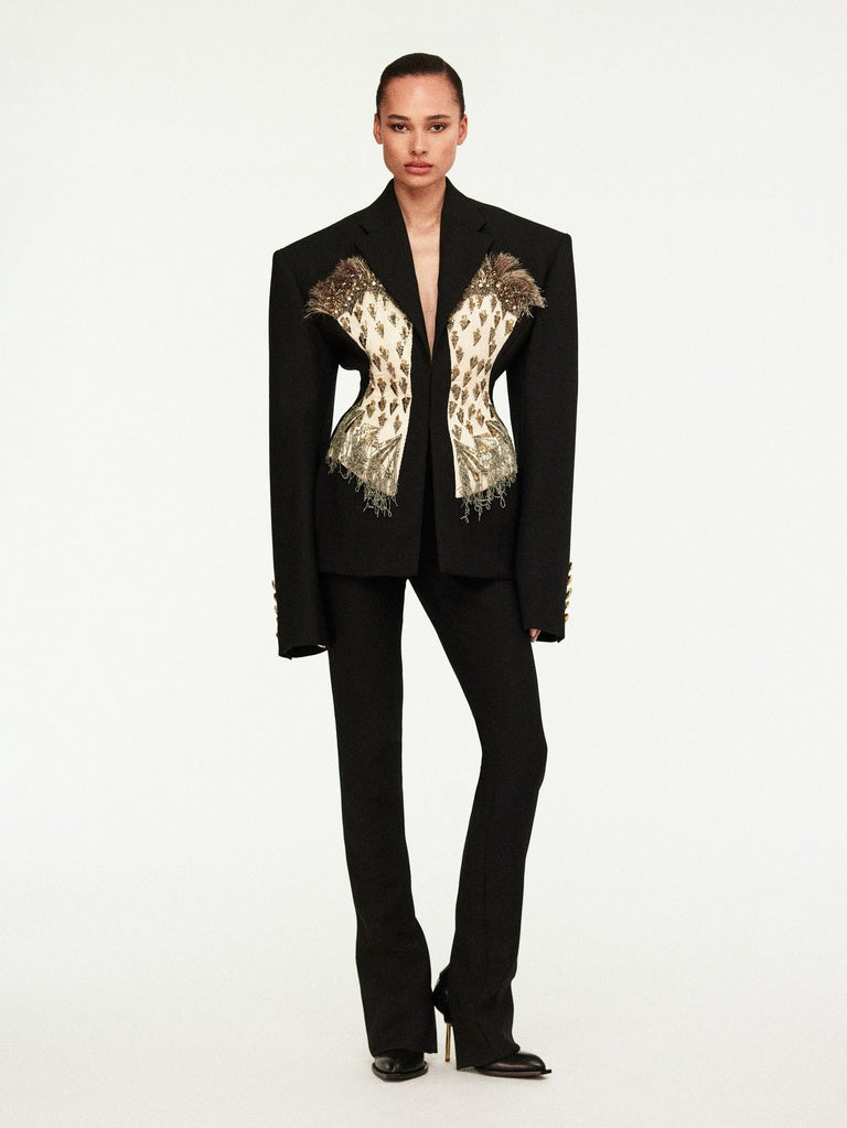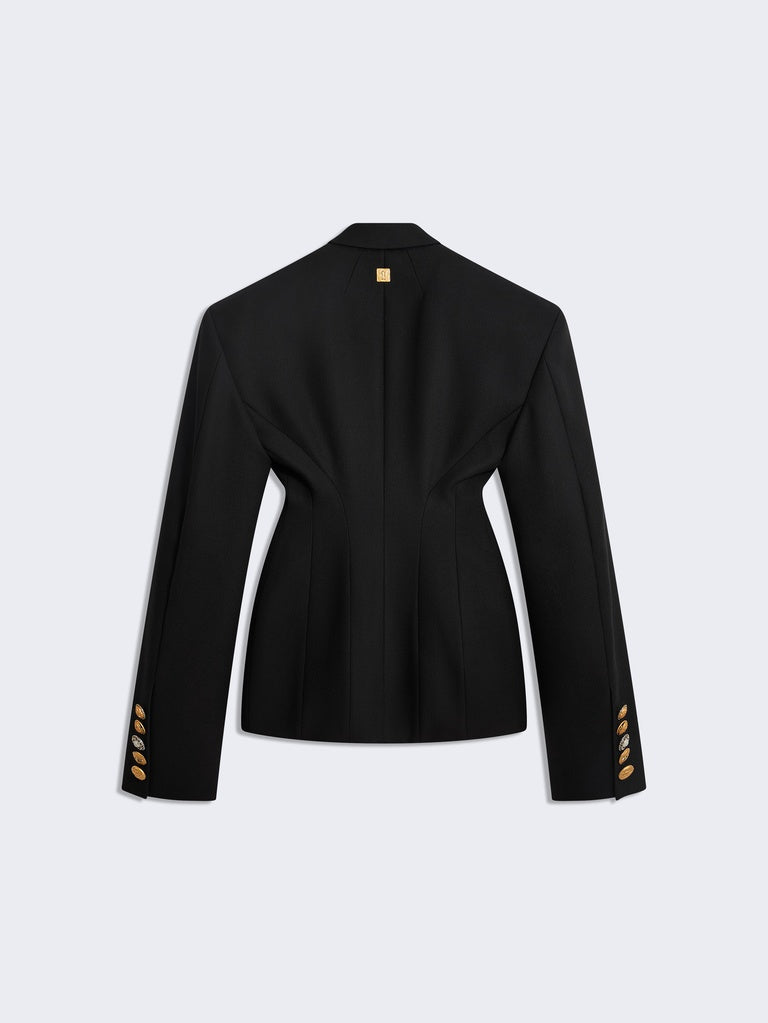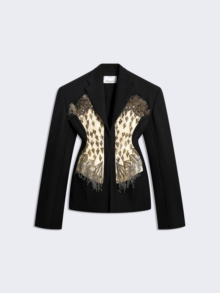 This jacket, with its broad shoulders and cinched waist thanks to back seams, is crafted from black wool crepe. It is embellished with trompe-l'œil corset embroidery in pearls, lamé thread, and gold satin, gold jewel buttons at the cuffs, and a signature gold-tone metal keyhole rivet at the back.