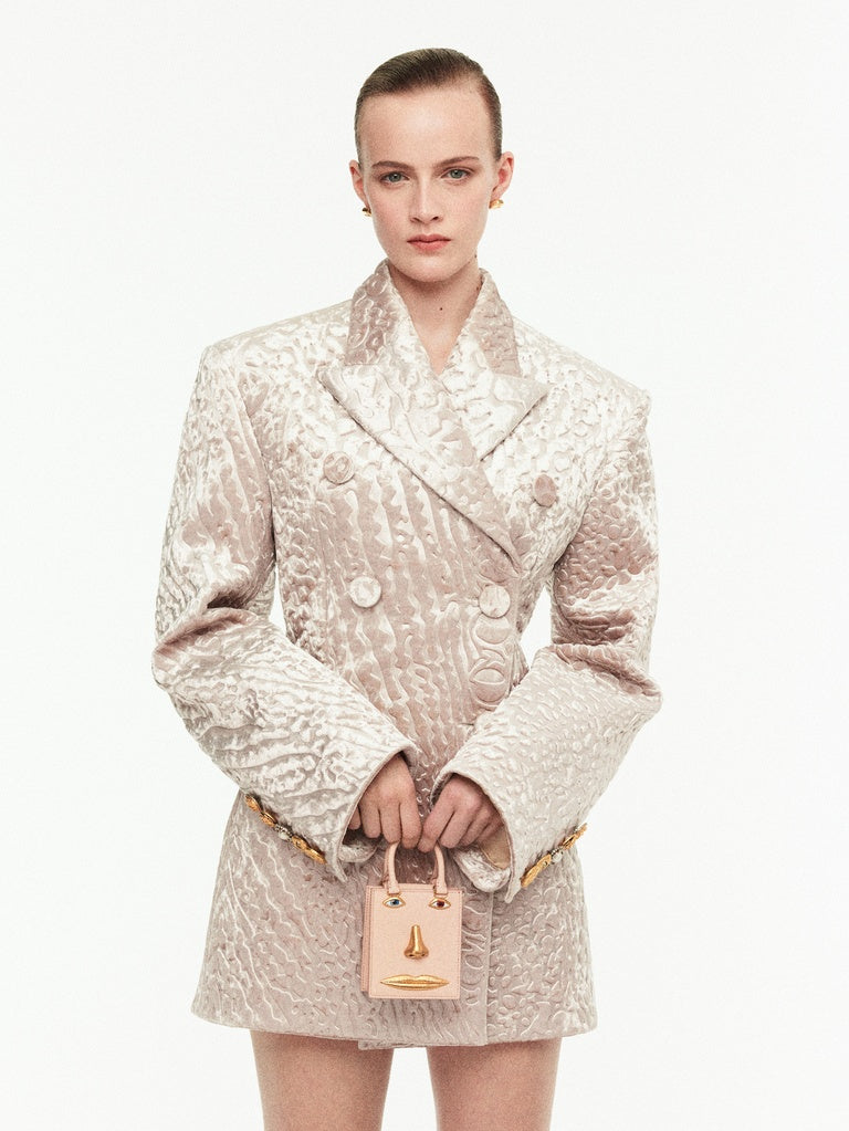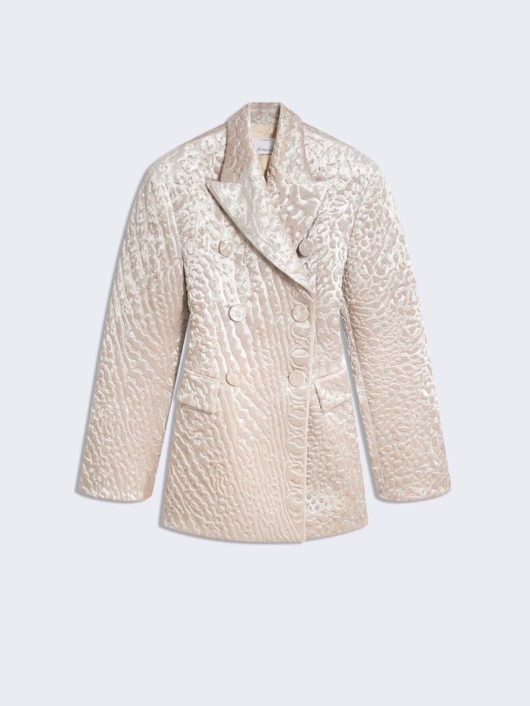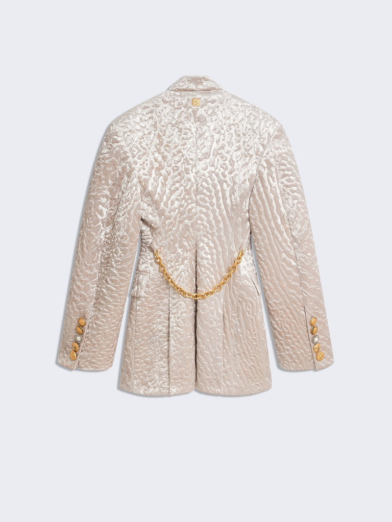 This double-breasted jacket, with its exaggeratedly wide shoulders and very cinched waist, is crafted from champagne-colored technical velvet embossed with a feather motif. It is embellished with gold jeweled buttons at the cuffs, a gold-tone metal chain at the back, and a signature Trou de Serrure rivet at the back.