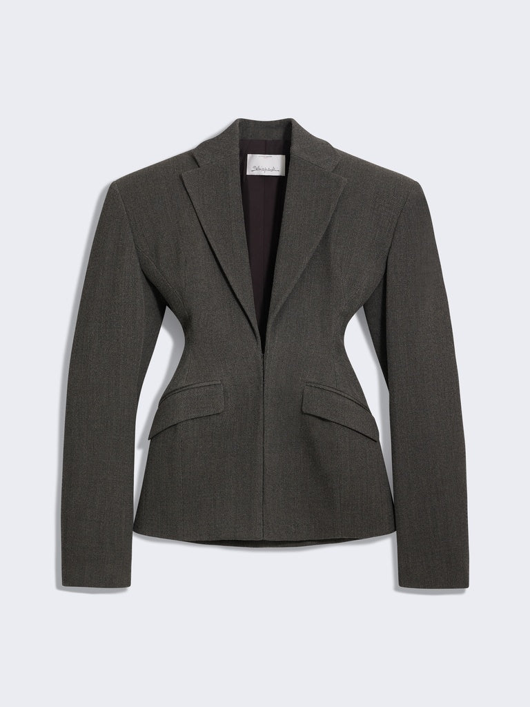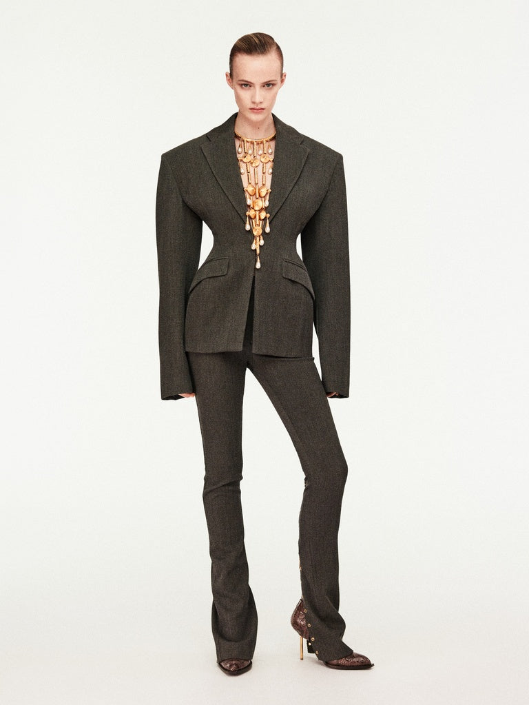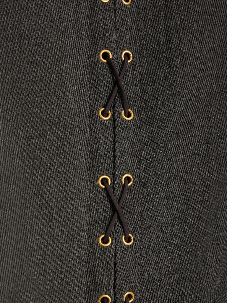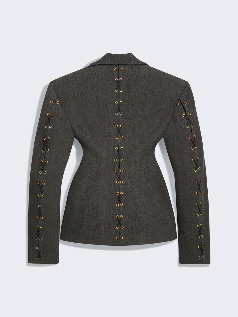 This jacket, with its broad shoulders and cinched waist thanks to back seams, is crafted from grey wool twill. It is embellished with gold-tone metal eyelets and lacing on the sleeves and center back, gold-tone jeweled buttons at the cuffs, and a signature gold-tone metal keyhole rivet at the back.