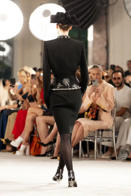 Veste de tailleur en laine sèche noire brodée du motif palmier issu des archives de la Maison en fil lamé, strass et sequins couleur argent. Jupe crayon assortie. Chapeau en feutre noir entièrement brodé de perles ton sur ton. Escarpins en satin noir à petit talon en métal argenté dont la bride est retenue par un bijou en forme de main.
