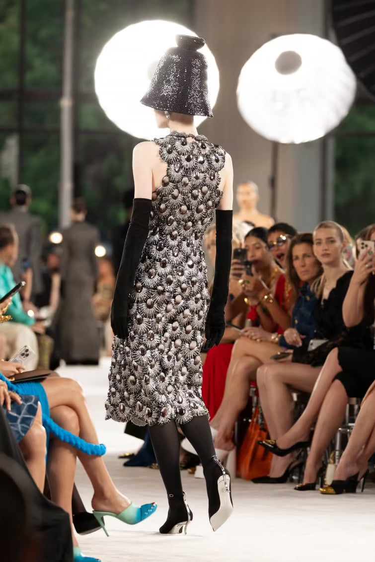 Sleeveless dress entirely embroidered with a graphic pattern in silver-coloured sequins, rhinestones and mirror dégradé cabochons. Bell hat embroidered with a black “galuchat” pattern. Black satin pumps with a strap, enhanced with a small silver metal heel ending in a hand.