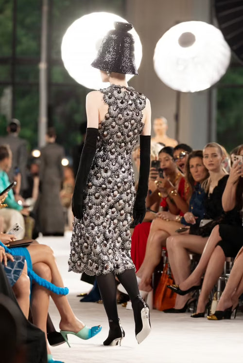 Robe sans manches entièrement brodée d’un motif graphique en perles, sequins, cristaux et cabochons dégradés couleur argent. Chapeau cloche brodé d’un motif « galuchat » noir. Escarpins à talons en satin noir à bride retenue par un bijou en forme de main en métal argenté.