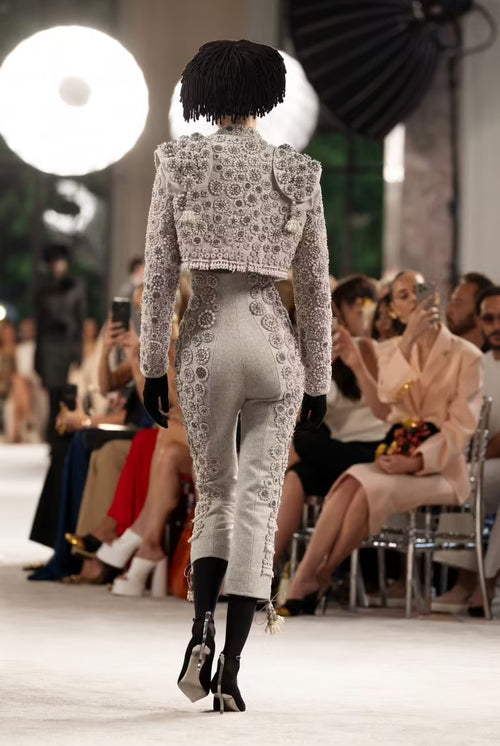Ensemble matador en laine feutrée gris entièrement brodé de perles baroques contrastées blanches et rehaussé d’épaulettes en forme de selle de cheval. Pantalon torero assorti. Chapeau en franges de coton noires perlées. Gants en velours noirs. Escarpins à talons en satin noir à bride retenue par un bijou en forme de main en métal argenté.