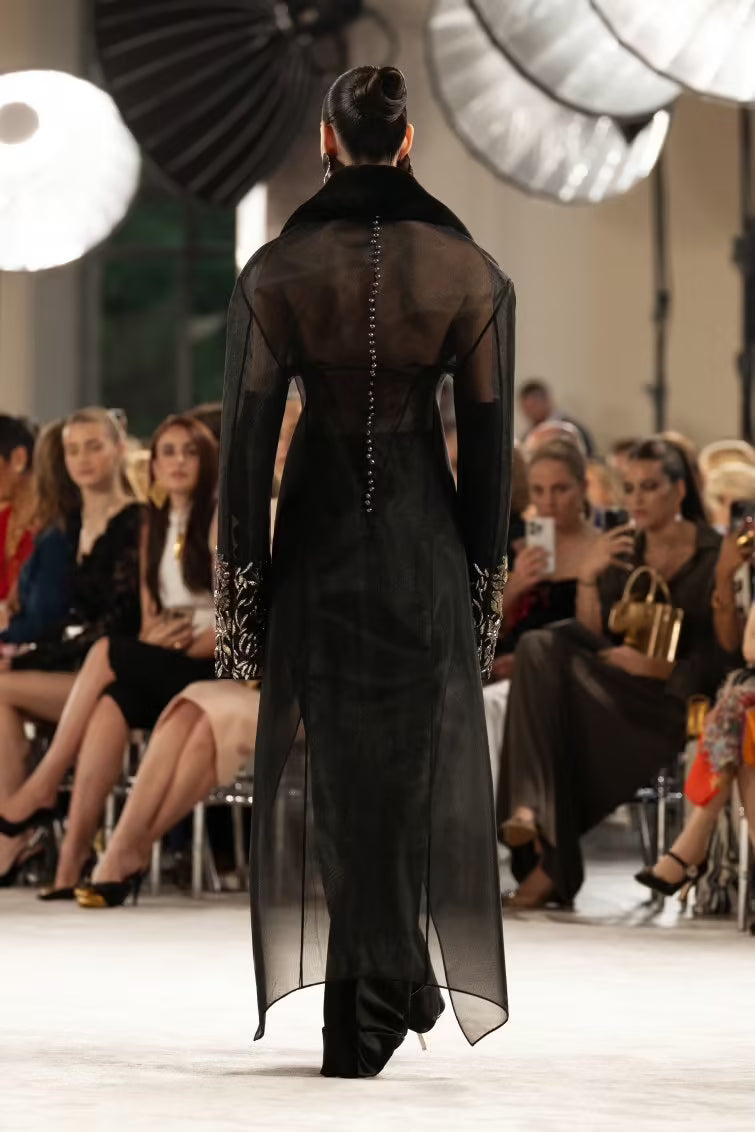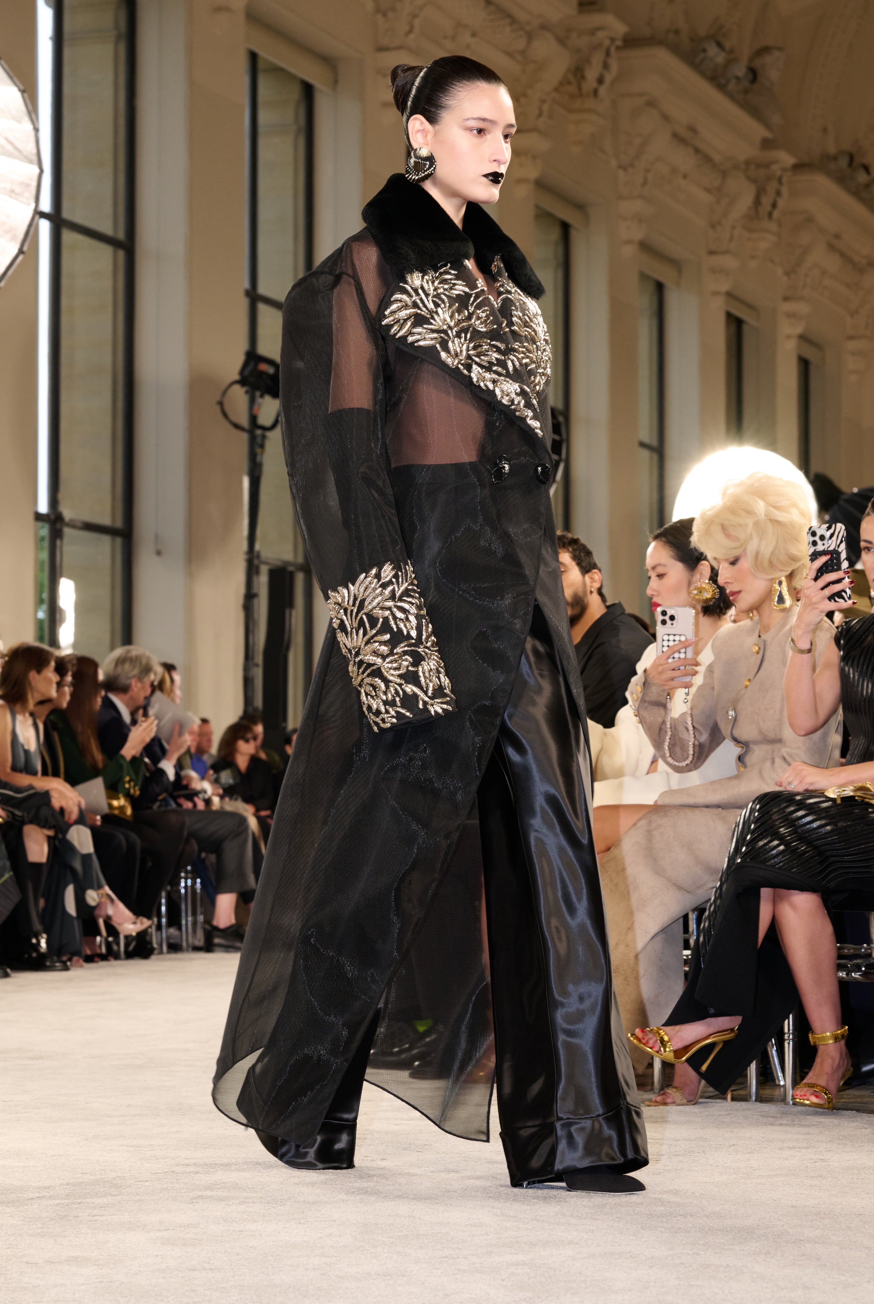 Black sheer tulle coat with tonal shearling collar. The coat lapels and sleeve hems are embroidered with a leaf motif in pale silver lamé thread. It is worn over high-waisted black satin trousers cut on the bias. Long black velvet gloves. Black satin mules with silver metal hand-shaped stiletto heel.