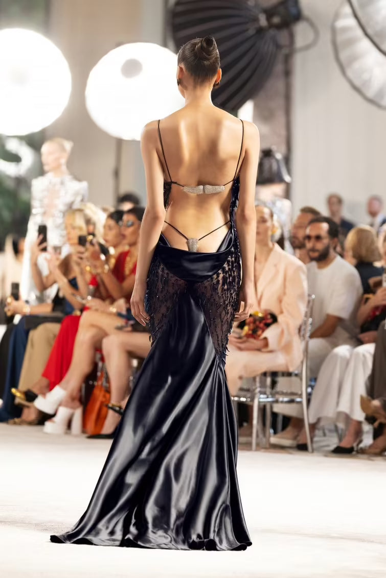 Sleeveless bias-cut dress in flowing satin, enhanced with a corset top and transparent tulle panels embroidered with horn-shaped elements on the sides of the dress, and a silver rhinestone jewelled thong at the back. Black satin mules enhanced by silver metal hand-shaped stiletto heel.