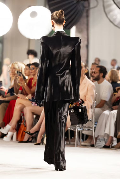 Tailleur en biais de satin noir composé d’une veste aux épaulettes en forme de selle de cheval et d’un pantalon évasé assorti. Il est porté sur une chemise en crêpe de soie blanche soulignée d’une lavallière brodée du Mètre Ruban signature. Escarpins à talons en satin blanc à bride retenue par un bijou en forme de main en métal argenté.