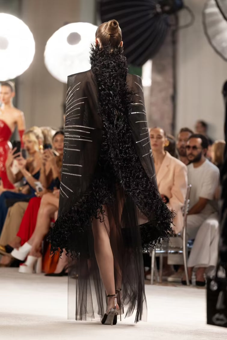Black transparent tulle cape embroidered with the emblematic Apollo de Versailles motif from the Maison’s archives in silver pearls, sequins and rhinestones, accented with tonal black horsehair at the ends. It is worn over a black transparent tulle skirt. Black velvet gloves. Black satin mules with silver metal hand-shaped stiletto heel.
