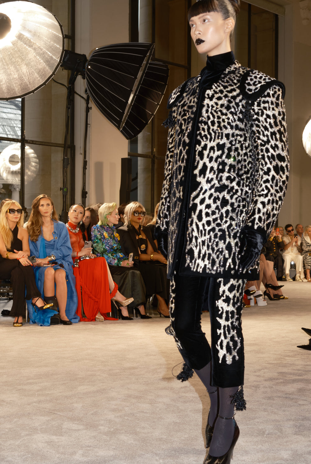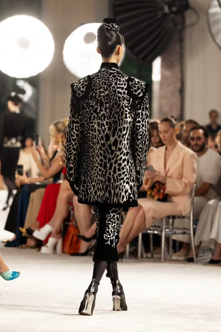 Embroidered leopard coat in matt velvet and washed satin faille embellished with saddle-inspired shoulder pads and matador pompoms. Matching torero pants. Black velvet gloves.Black satin slingbacks enhanced with silver metal hand-shaped stiletto heel.