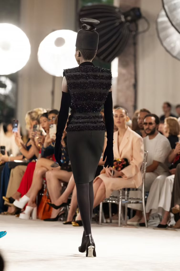Sleeveless tailored jacket in black wool and silk crepe embellished with tonal pearl embroidery, tied at the waist with a tonal velvet belt. Matching black silk crepe pencil skirt. Black velvet and satin bibis worn one on top of the other in a surreal stack. Long black velvet gloves. Black satin slingbacks and silver metal hand-shaped stiletto heel.