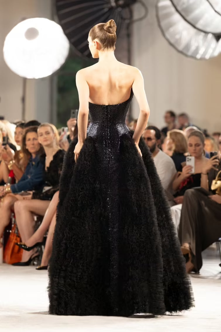 Aerodynamic bustier dress in black silk tulle and black crepe embroidered with a tonal “galuchat” motif, enhanced by conical pleats in gathered tulle. Black satin slingbacks enhanced with silver metal hand-shaped stiletto heel.