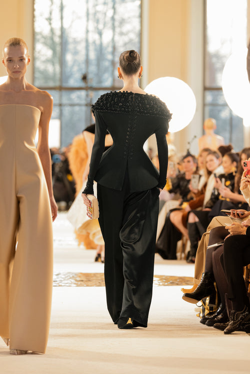Veste de smoking matador à épaules découvertes en jersey texturé noir et manches en jersey souple brodée de cordons, de pompons, de strass et de mini pampilles ton sur ton, rehaussée d’une basque et lacée au dos. Elle est portée sur un soutien-gorge brodé assorti et avec un pantalon de smoking en satin liquide noir. Mule à talon rehaussée d’un décolleté asymétrique ondulé en toile corset noire.