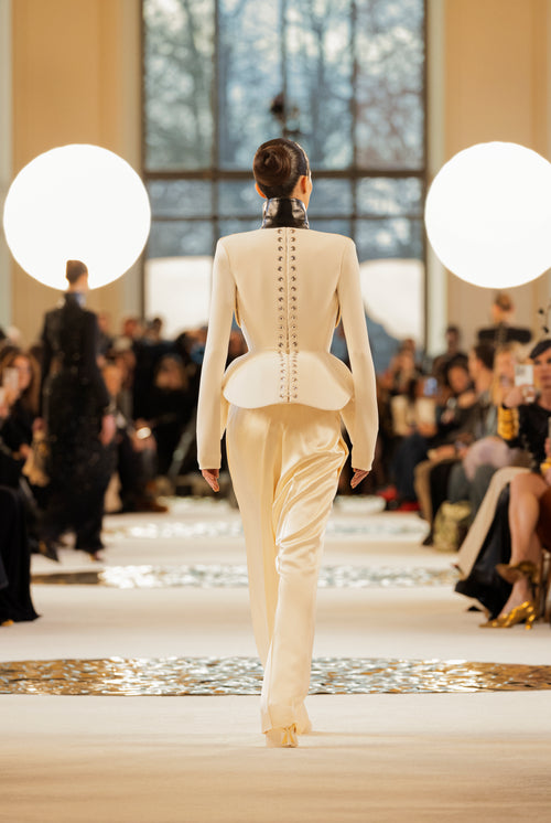 Veste signature en forme de S lacée dans le dos en jersey compact écru rehaussée d’une broderie rembourrée en ruban beurre et d’un col en cuir noir contrasté. Elle est portée avec un pantalon en satin liquide écru. Boucles d’oreilles rondes ornées de strass et surmontées d’une perle en nacre. Mule à talon rehaussée d’un décolleté asymétrique ondulé en toile corset pointillée ivoire.