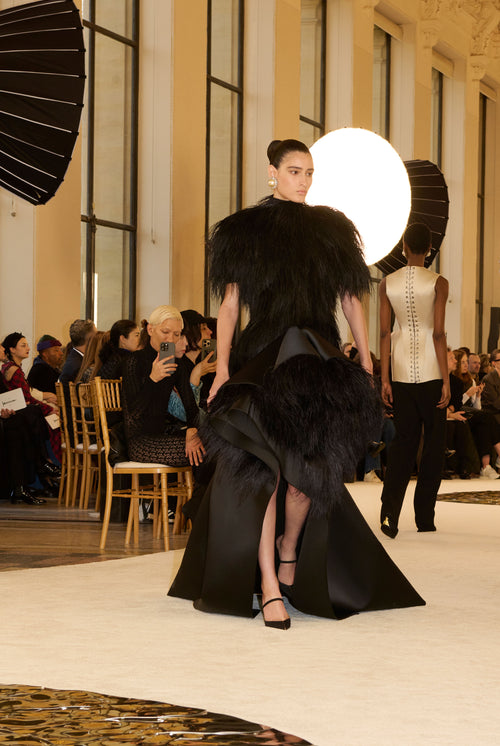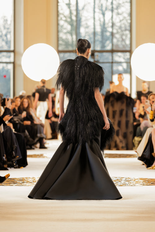 Robe “fourrure de singe” trompe l’œil en néoprène noir entièrement brodée de franges de plumes d’autruche baignées dans la glycérine et rehaussée d’une jupe à volants en jersey texturé ton sur ton. Boucles d’oreilles rondes ornées de strass et surmontées de perles en nacre. Mule à talon brodée matador rehaussée d’un décolleté asymétrique ondulé.