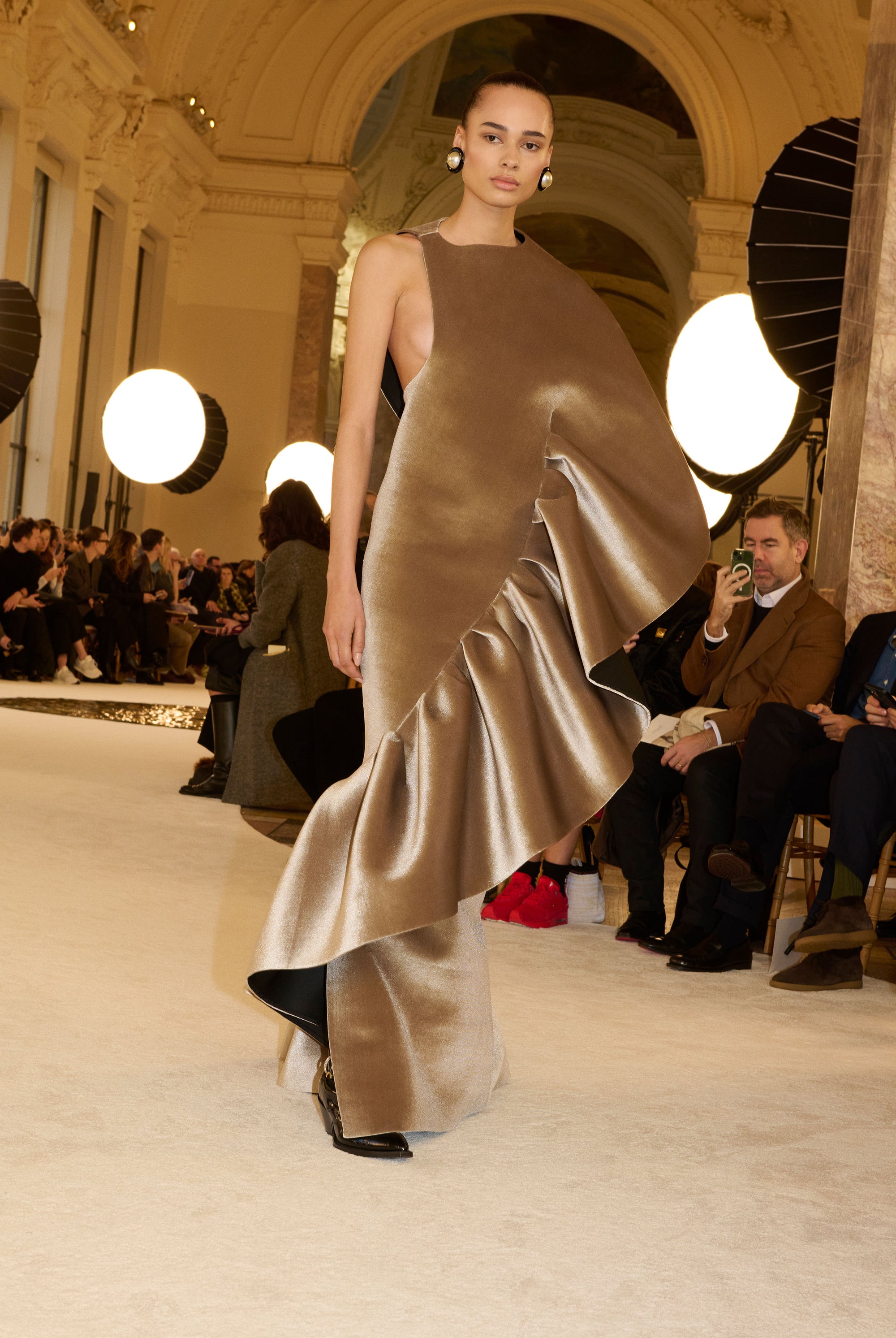 Robe à volants sans couture en néoprène velours couleur vison rehaussé d’une doublure noire contrasté réalisée d’un seul geste. Bottes de cow-boy en cuir noir brillant gaufré effet croco, incrustées d’une oreille moulée recouverte de piercings à strass.