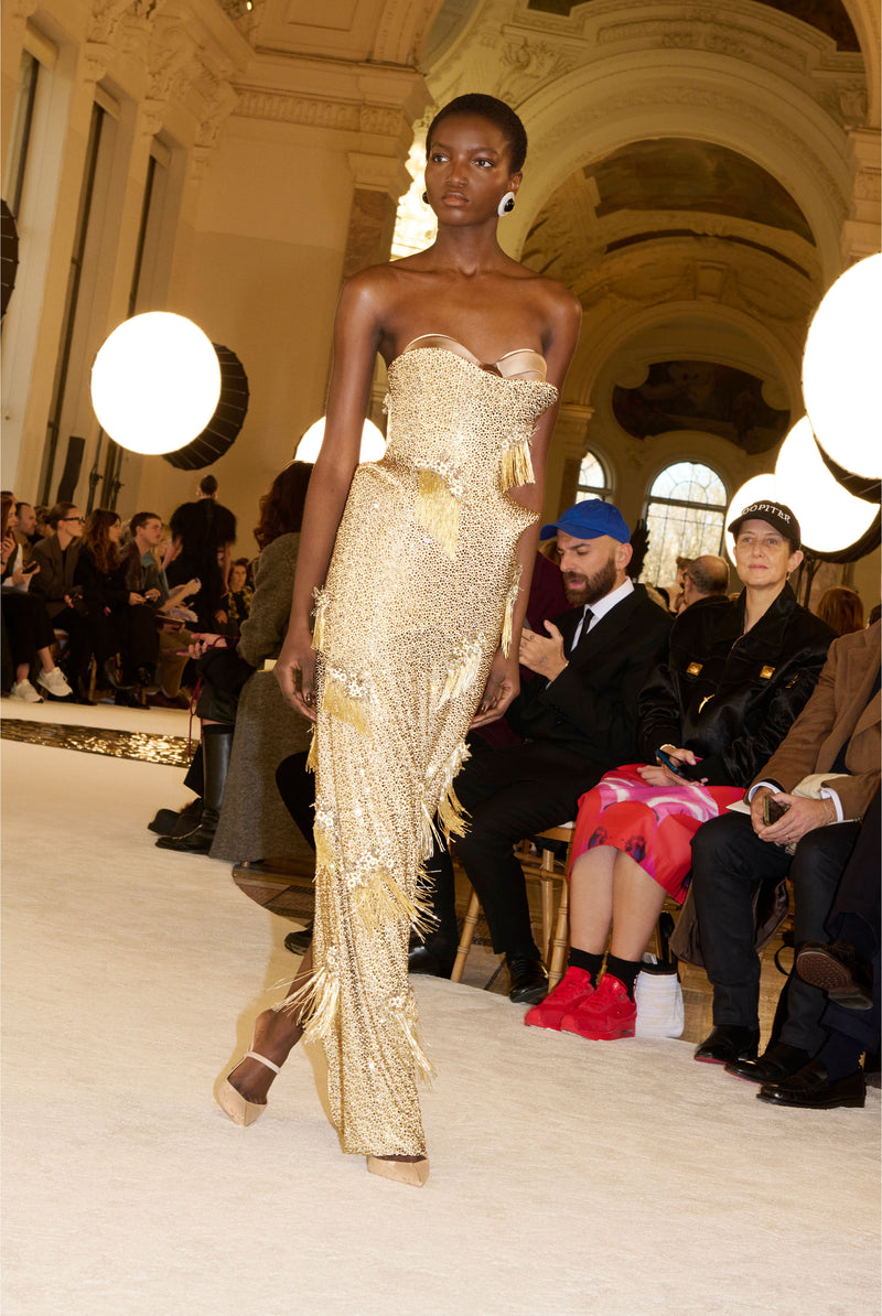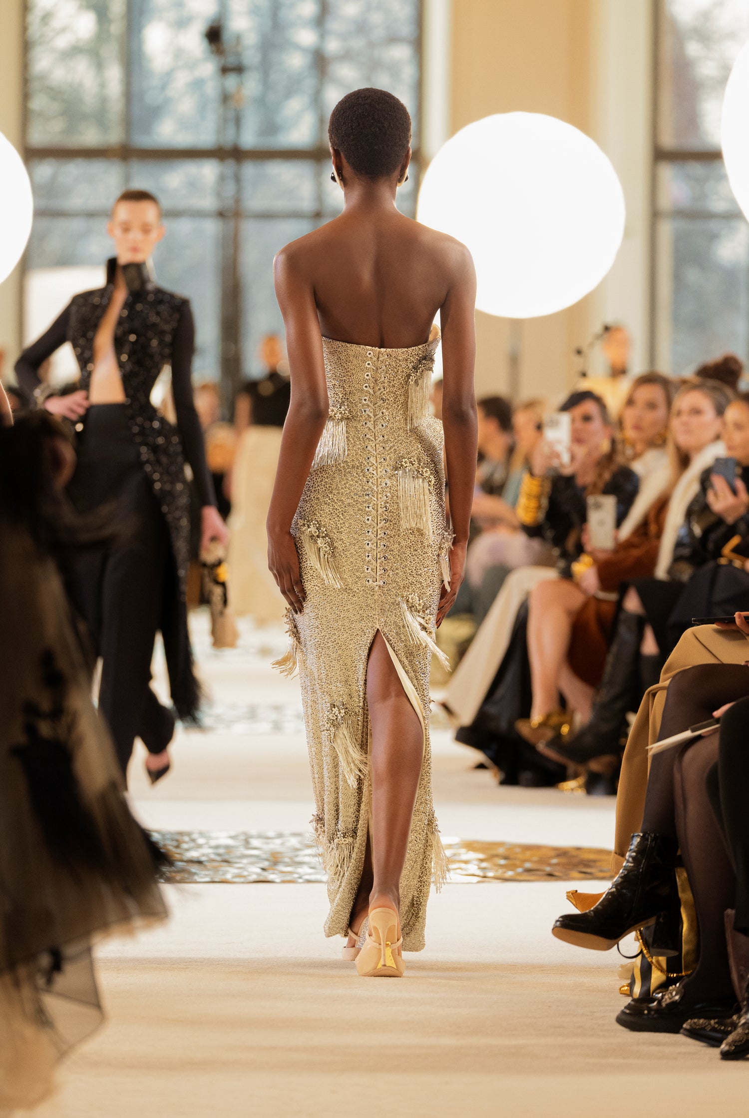 Robe fourreau bustier entièrement brodée de strass fumés rehaussée de hanches aiguisées et lacée au dos. Elle est portée sur un soutien-gorge en plumes d’autruche couleur vison. Sandale à talon rehaussée d’un décolleté asymétrique et ondulé en toile corset pointillée noire. Boucles d’oreilles rondes en nacre surmontées d’une perle noire et de strass.