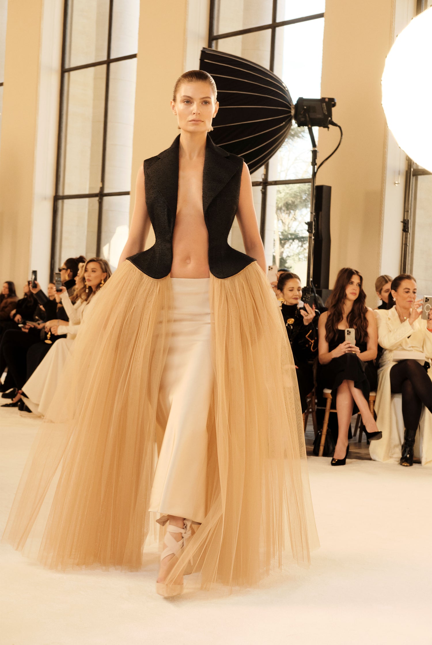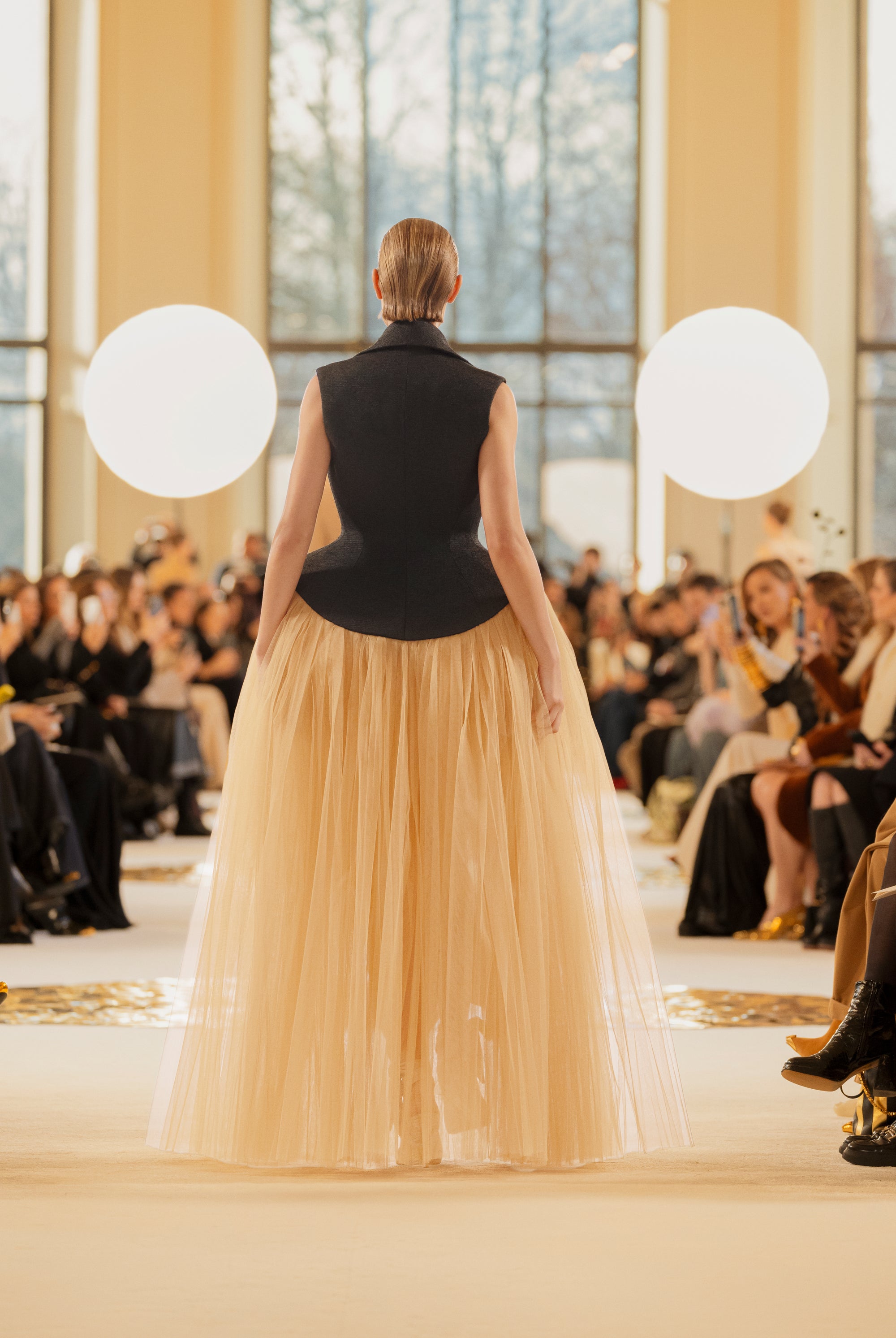 Veste à basque ouverte confectionnées en rubans en laine noire vintages rehaussée d’une extension en tulle nude contrasté. Elle est portée sur une jupe colonne en double satin de couleur sable. Sandale à talon rehaussée d’un décolleté asymétrique ondulé en toile corsetée florale nude.