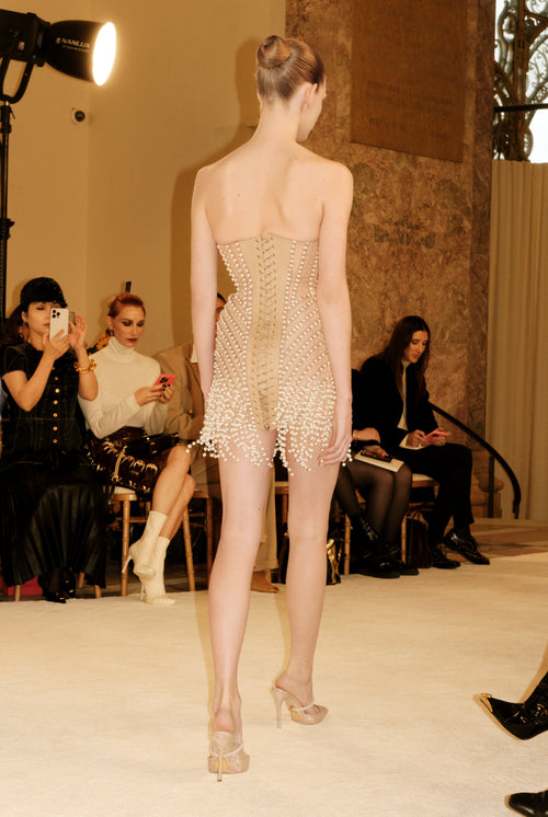 Robe bustier corsetée en maille nude rehaussée de hanches exagérées et entièrement brodée de perles trompe l’œil en point de satin. Mule à talon rehaussée d’un décolleté asymétrique ondulé en toile corset fleurie.