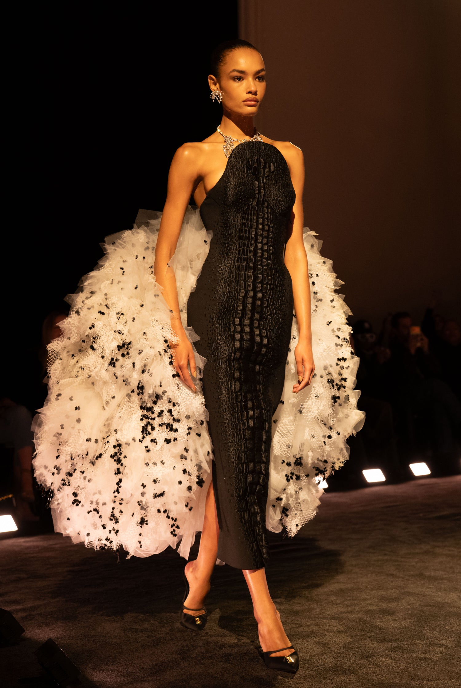 Bustier dress in black wool crepe embellished with a satin-stitch trompe l’œil crocodile tail on the front and a white tulle cloud embroidered with black mimosas in silk thread scattered throughout at the back. Chandelier earrings in warm silver with black stones inspired by the archives of the Maison. Warm silver chain necklace with rhinestones and three knots in the center, inspired by the Maison's archives. Black satin mule with an asymmetrical wavy vamp embellished with a gold metal Keyhole bijou and a curved heel.