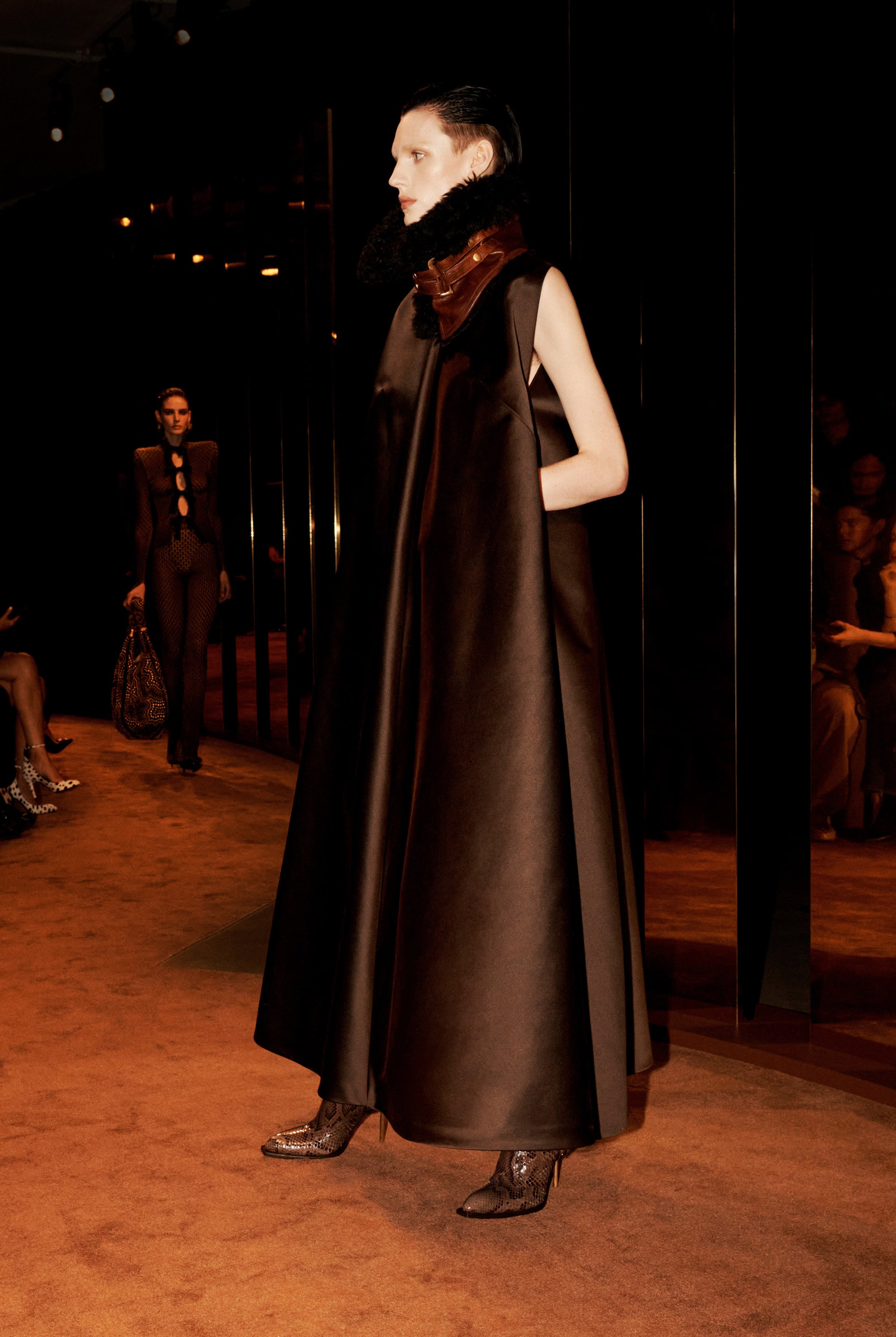 Robe trapèze sans manches en faille duchesse brune. Elle est portée avec un col amovible en shearling noir et cuir de veau bordeaux contrasté. Bottines style western en peau de python à talon aiguille orné d’un anneau strassé et d’une lanière Trou de Serrure amovible en cuir ton sur ton.