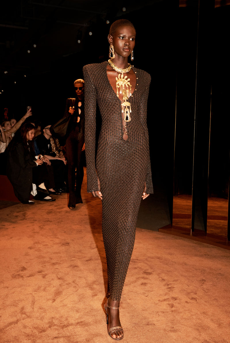 Robe longue près du corps en maille marron laminée noire tricotée effet « écailles de serpent » déboutonnée au niveau de la poitrine et des manches. Le torse est recouvert d’un long collier plastron esprit chandelier en laiton doré martelé avec empilement de bijoux à l’effigie des codes emblématiques de la Maison. Boucles d’oreille en laiton doré texturé et miroir à l’effigie du code Trou de Serrure emblématique de la Maison. Sandales à talon en peau de python décorées d’une broderie Mètre Ruban dorée signature.