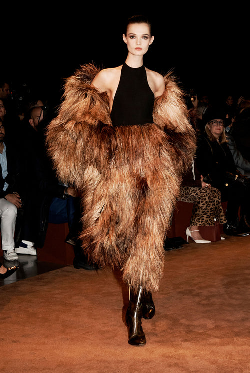 Veste en velours technique noir entièrement brodée de plumes d’autruche glycérinées couleur rouille et étole assortie. Elle sont portées par-dessus un body en velours noir aux épaules dénudées et une jupe crayon en jersey noir brodée de plumes d’autruche glycérinées couleur rouille assortie. Bottines style western en cuir brossé marron à talon aiguille orné d’un anneau strassé et d’une lanière Trou de Serrure amovible en cuir ton sur ton.