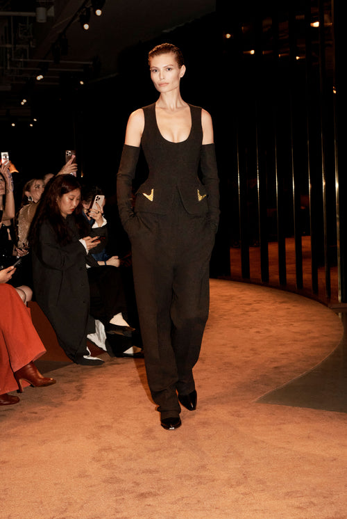 Gilet de costume sans manche en crêpe de laine noire agrémenté d’une encolure dégagée, de poches à rabat ornées d’embouts en métal doré d’inspiration cowboy. Mitaines assorties. Pantalon à pinces en crêpe de laine noir à la fourche très basse. Bottines style western en cuir noir à talon aiguille orné d’un anneau strassé et d’une lanière Trou de Serrure amovible en cuir ton sur ton.