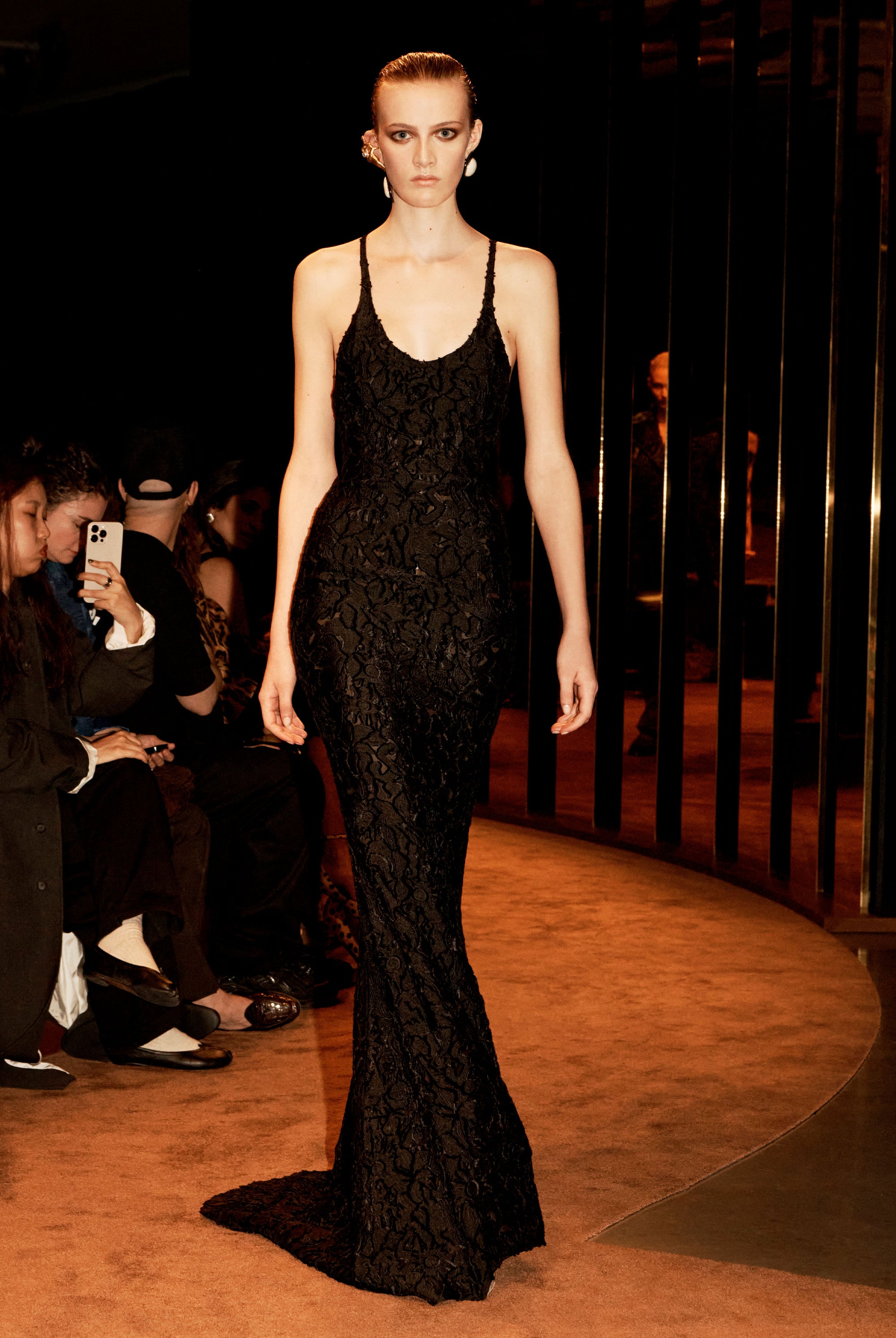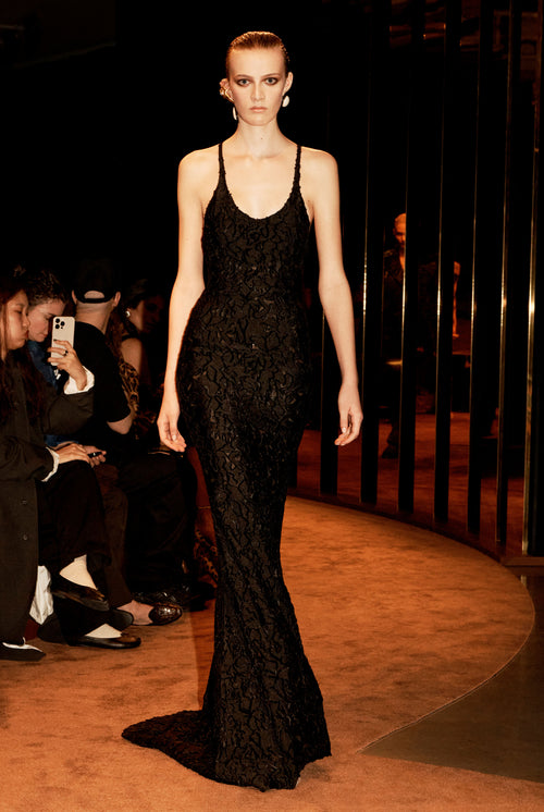 Robe longue à fines bretelles croisées dans le dos en fil coupé noir imprimée des codes emblématiques de la Maison. Boucles d’oreille représentant un disque en corne surmonté d’une perle en nacre. Mules à talon en velours noir rehaussées d’un décolleté asymétrique et ondulé.