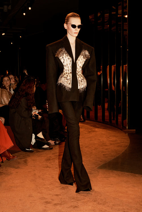 Veste à larges épaules et taille cintrée en crêpe de laine noire décorée d’un corset trompe l’œil brodé en perles, lame et satin. Pantalon bootcut en crêpe de laine noire à la jambe très serrée fendue sur le bas. Bottes style western en cuir noir à talon aiguille orné d’un anneau strassé et d’une lanière Trou de Serrure amovible en cuir ton sur ton.