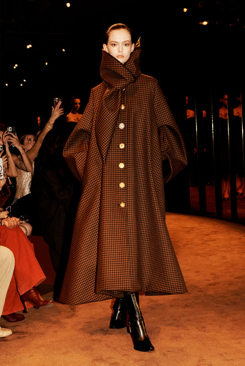 Grand manteau en laine à carreaux marrons et noirs doté de manches extra-larges et d’un col écharpe doublé en cuir contrasté noir. Boucles d’oreille représentant un disque en corne surmonté d’une perle en nacre. Bottines style western en cuir noir à talon aiguille orné d’un anneau strassé et d’une lanière Trou de Serrure amovible en cuir ton sur ton.