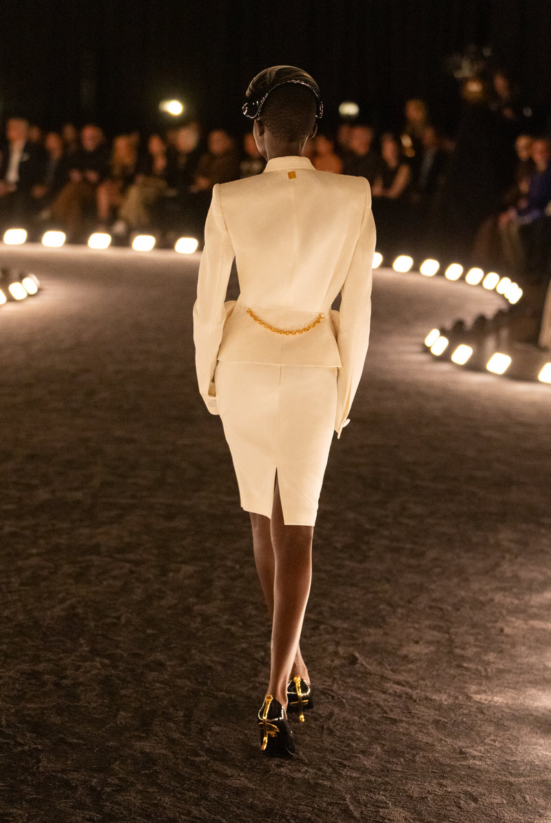 Veste cintrée à simple boutonnage en toile de lin, laine et mohair blancs rehaussée d’un petit col tailleur, de poches passepoilées et de volumes 3D en satin au niveau de la taille. Elle est portée sur une jupe crayon assortie aux poches passepoilées arrondies. Chapeau noir au reflet brillant. Escarpins à petits talons en cuir vernis noir rehaussés d’un talon incurvé en métal doré finissant par une main sculptée.