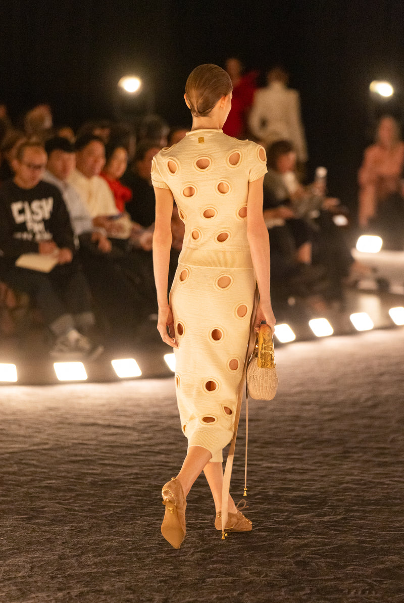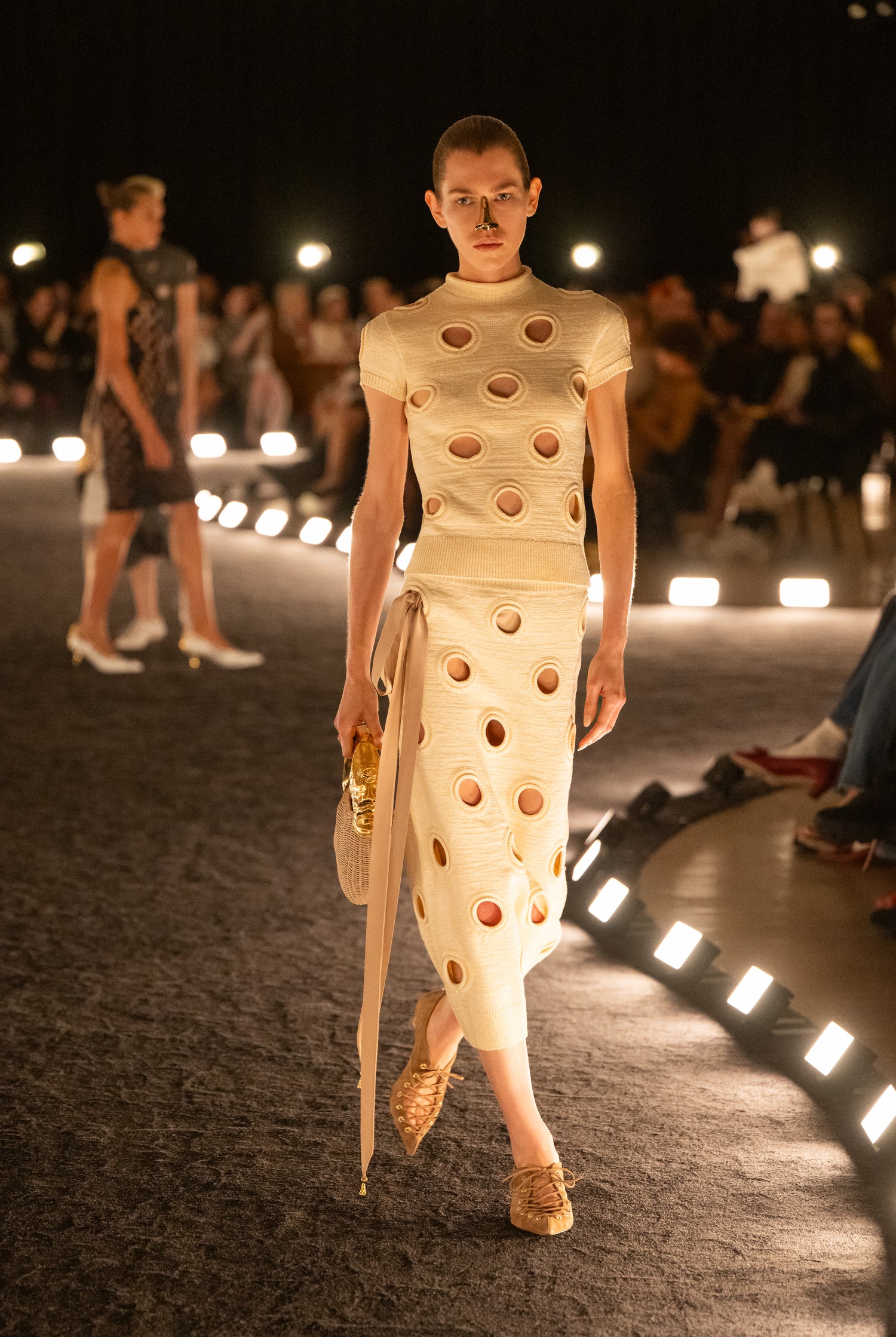 Ensemble en maille fine écrue ajourée selon un motif de pois composé d’un top à manches courtes et d’une jupe colonne assortie. Sac en cuir beige effet rotin rehaussé d’une anse rigide en laiton doré aux détails anatomiques. Bijou de nez surréaliste en laiton doré. Bottines derby en suède couleur taupe au laçage corset et décorées d’œillets bijoux dépareillés en métal doré et strass et d’un petit talon évoquant un soleil.