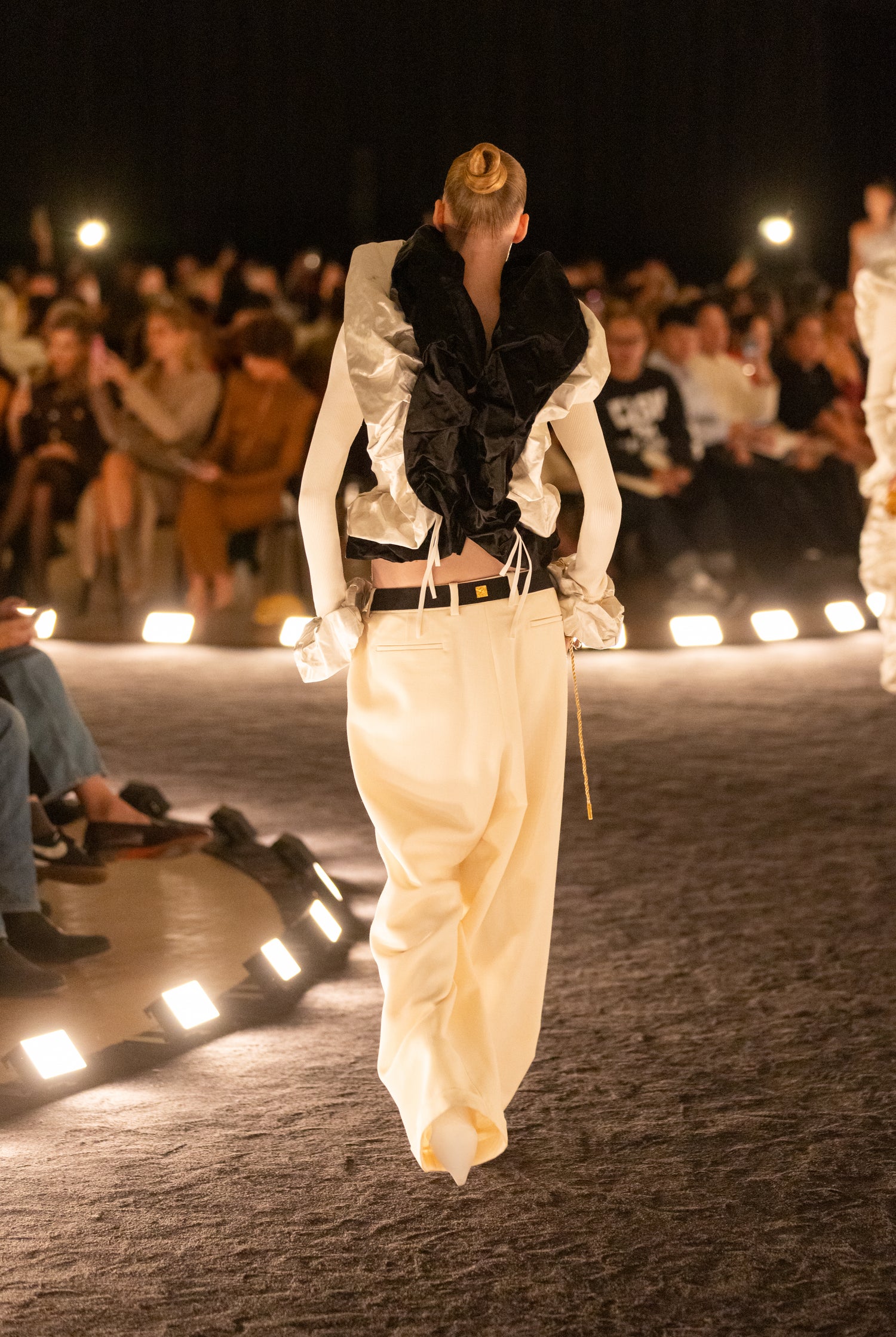 Cardigan en maille viscose blanche rehaussé de volants sculpturaux en satin à mémoire de forme. Il est porté à l’envers sur un autre cardigan noir assorti. Pantalon oversize à pinces en toile de lin écru, porté avec une ceinture ruban. Bracelet os en ficelles et laiton argenté. Escarpins en cuir vernis blanc rehaussés de dessins à l’effigie des codes de la Maison peints à la main.