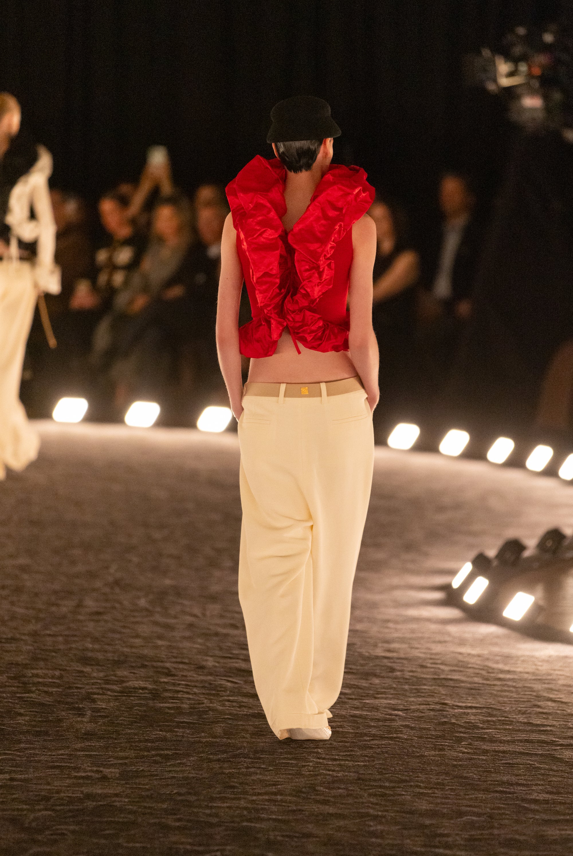 Top sans manche en maille viscose rouge rehaussé d’un volant sculptural en satin à mémoire de forme. Pantalon oversize en toile chinée écrue retenu par une ceinture ruban. Chapeau cloche en feutre noir. Bottines derby en cuir blanc tressé à la main au laçage corset et décorées d’œillets bijoux dépareillés en métal doré et strass et d’un petit talon évoquant un soleil.