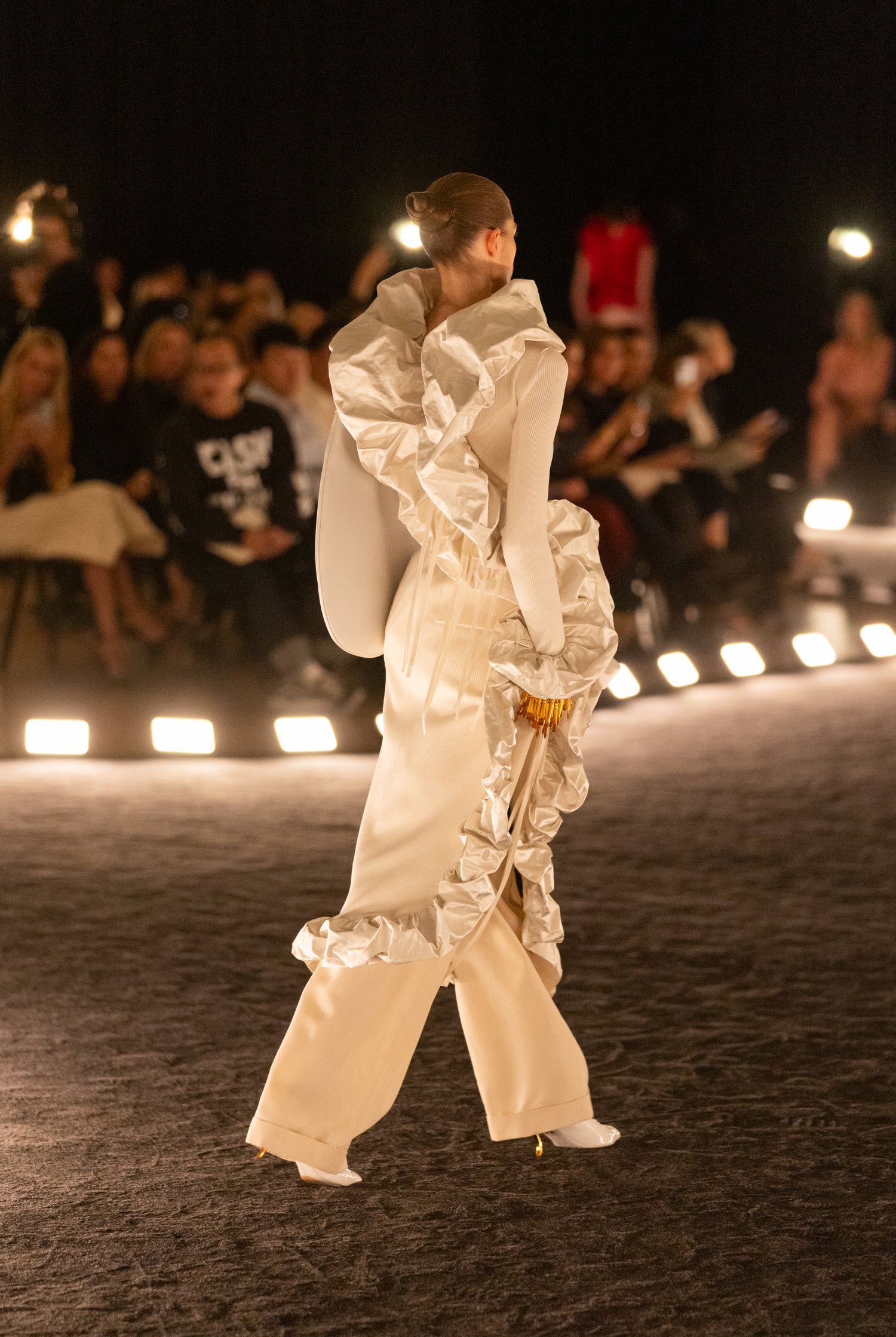 Robe asymétrique en maille viscose blanche rehaussée de volants sculpturaux en satin à mémoire de forme. Elle est portée avec un cardigan assorti porté à l’envers par-dessus la robe et un pantalon oversize en toile chinée écrue à pinces. Bracelet rehaussé d’une multitude de bijoux pinceaux en laiton doré. Sac Soufflé en cuir blanc orné de bijoux anatomiques en émail ton sur ton sur l’anse. Escarpins en cuir vernis blanc à petits talons rehaussés de dessins à l’effigie des codes de la Maison peints à la main.