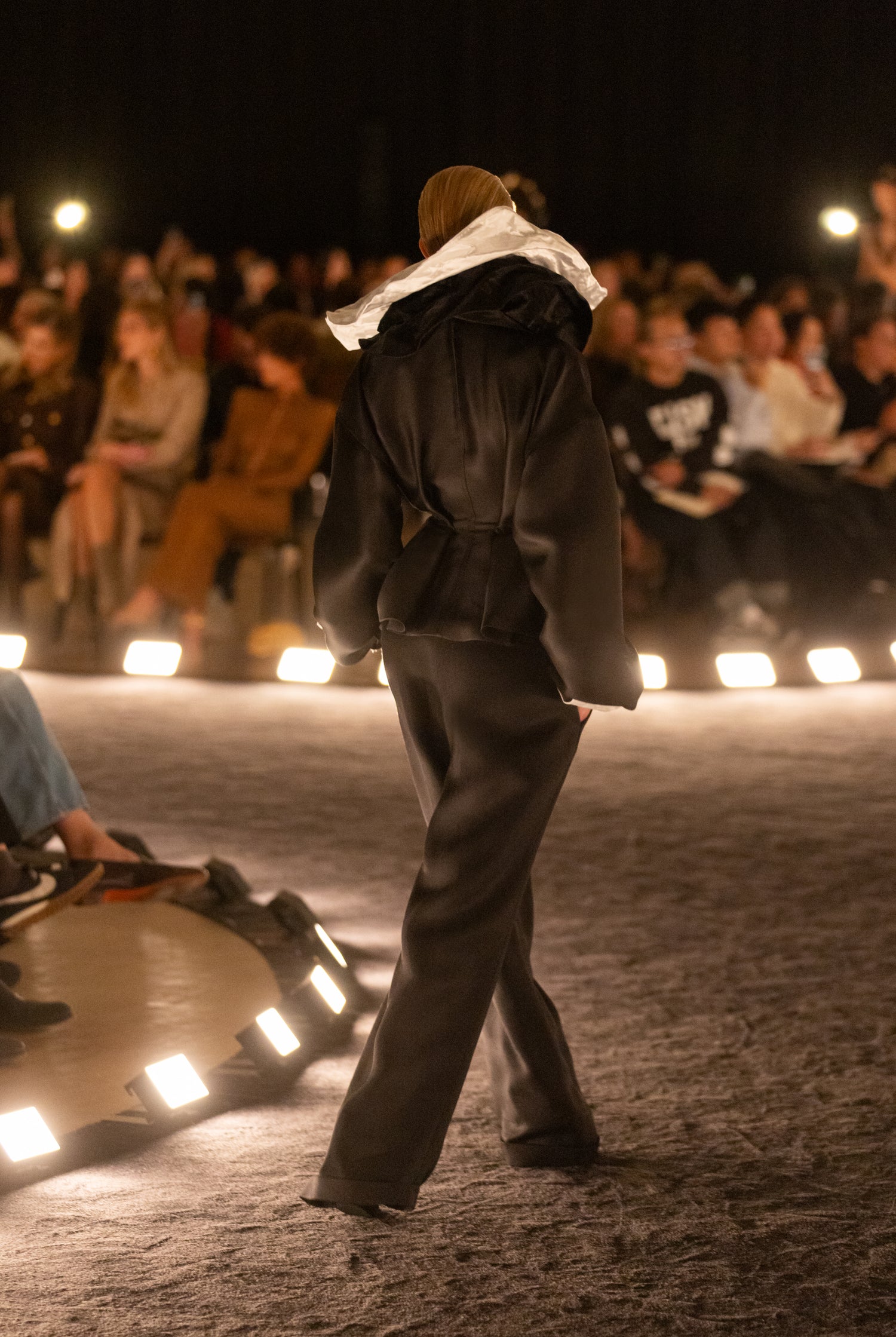 Veste à larges manches en gazar noir rehaussée d’un col sculptural en satin à mémoire de forme blanc contrasté. Pantalon oversize en toile de lin noire à pinces. Boucles d’oreille en pierre de sel qui s’illuminent. Escarpins à petits talons en cuir vernis noir décorés de dessins représentant les codes signatures de la Maison peints à la main.