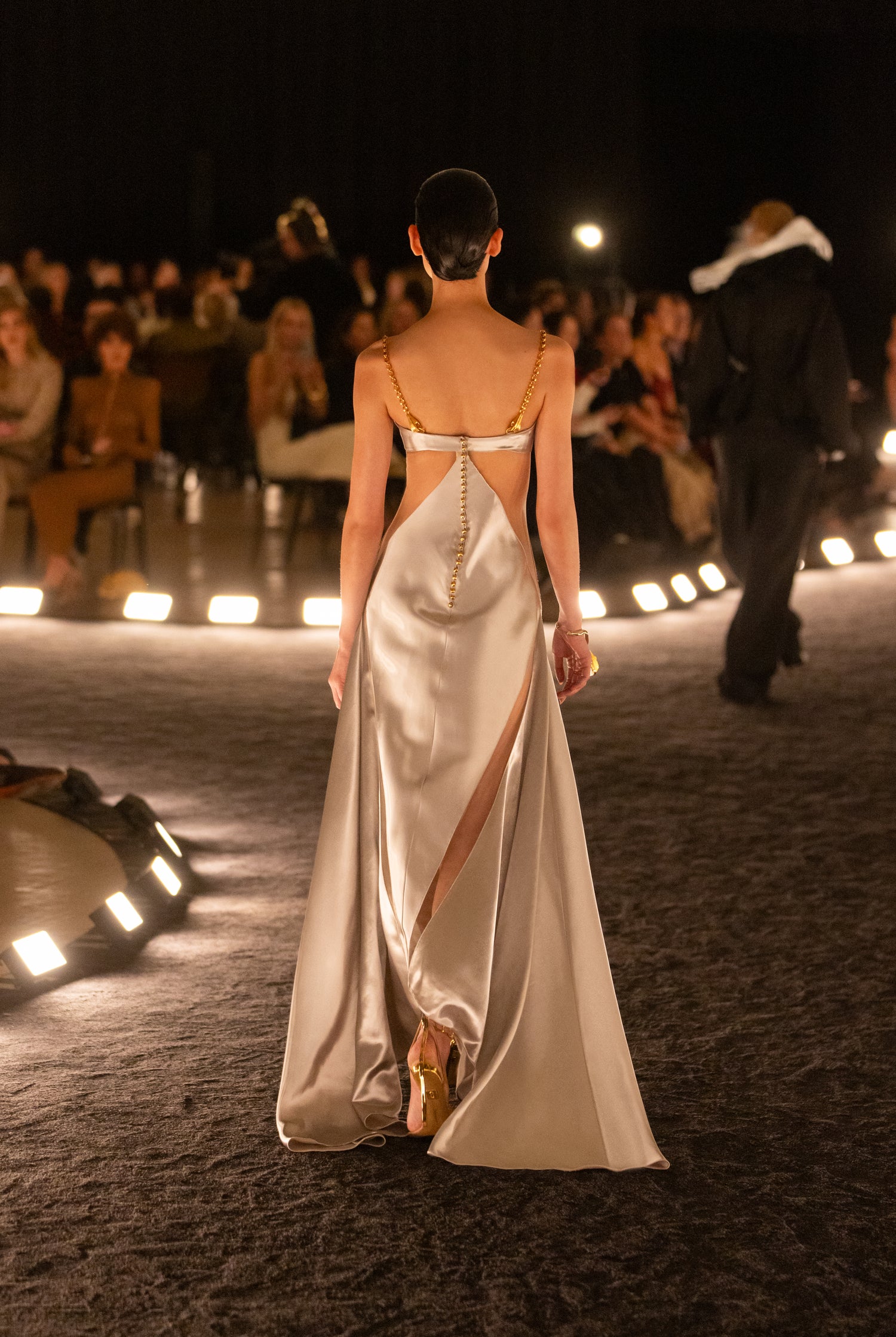 Robe longue à dos nageur en satin argent rehaussée de découpes et d’inserts de tulle révélant la peau sur les côtés de la robe. Sa coupe en biais est agrémentée d’un col bénitier, de bretelles bijoux dorées et de boutons bijoux dorés tout le long du dos. Bracelet jonc avec un pendentif pierre de sel qui s’illumine. Sandales à bout pointu en suède couleur taupe dotées d’un talon incurvé en métal doré finissant par une main sculptée retenant les brides.