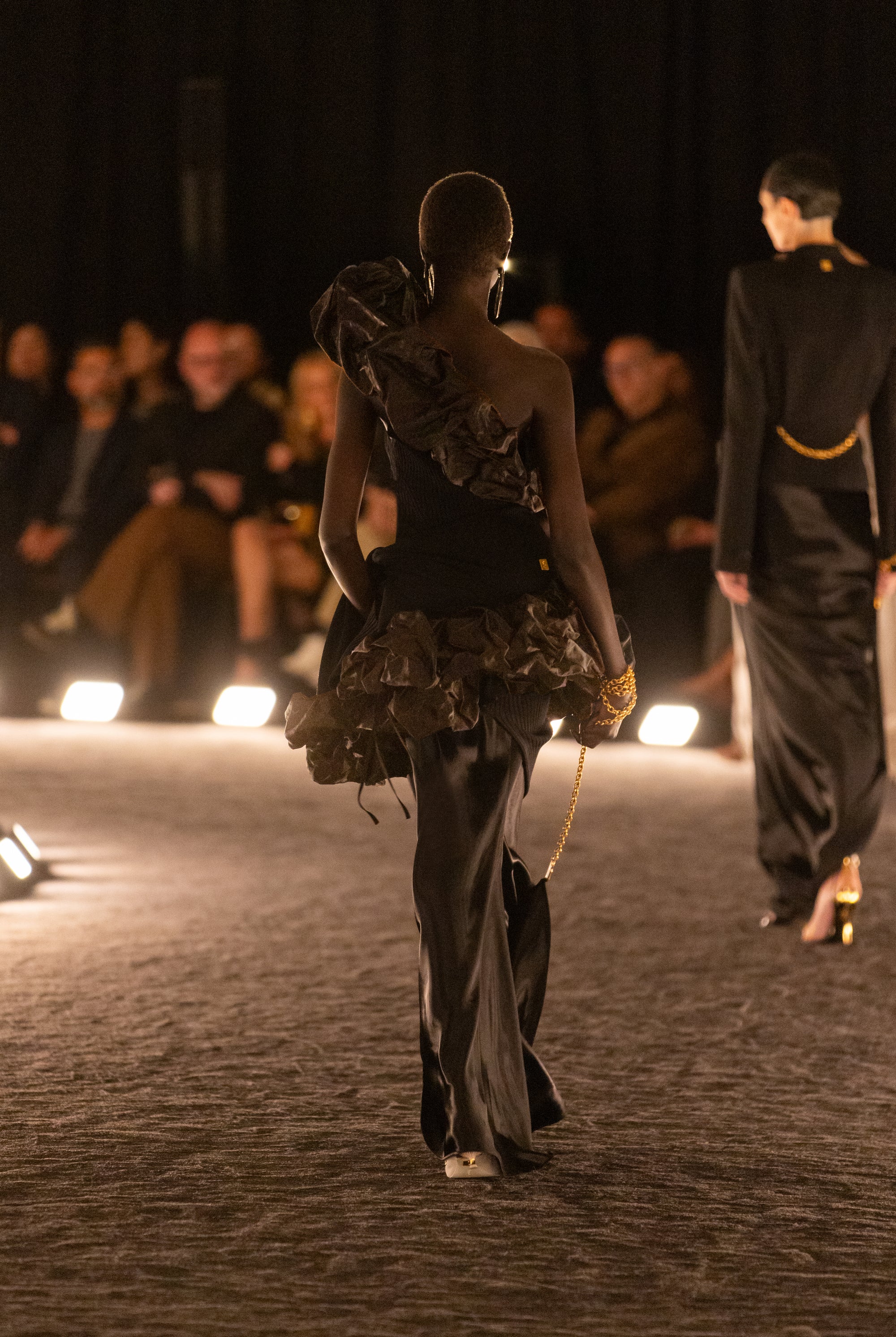 Robe asymétrique sans manches en maille viscose noire rehaussée d’un volant sculptural en satin à mémoire de forme. Elle est portée sur une jupe longue en satin fluide noir dont le tissu est ramassé sur le côté droit par une chaîne dorée à tenir à la main ou à attacher autour de la taille en ceinture. Boucles d’oreilles pendantes inspirées de l’art minoen avec gravure représentant la Place Vendôme. Bottines derby en cuir blanc tressé à la main au laçage corset et rehaussées d’œillets bijoux dépareillés en métal doré et strass et d’un petit talon évoquant un soleil.
