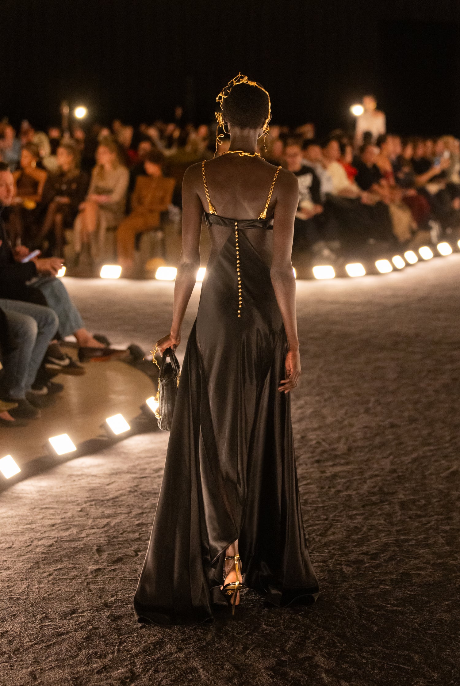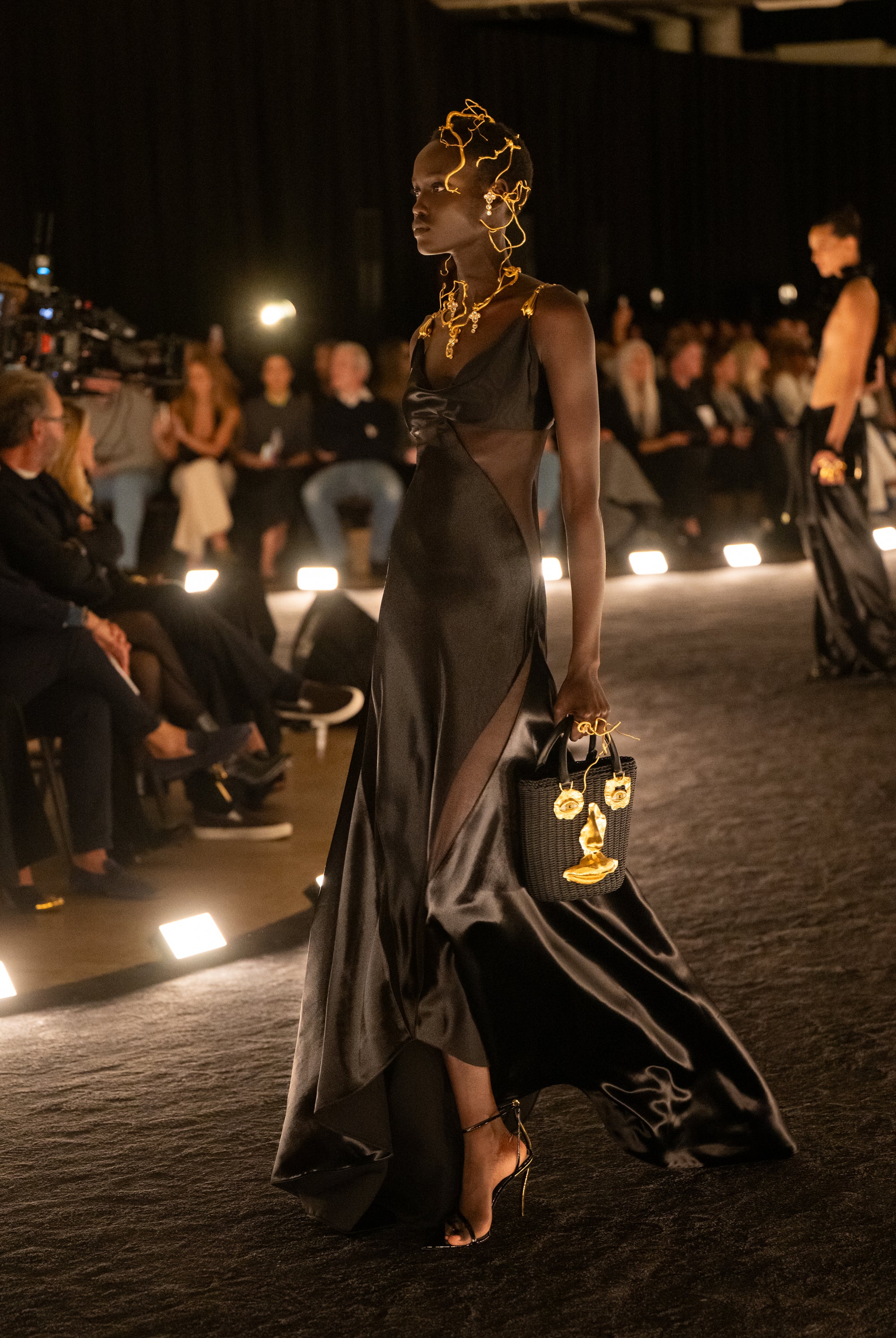 Robe longue en satin noir rehaussée de découpes et d’inserts de tulle révélant la peau sur les côtés de la robe. Sa coupe en biais est agrémentée d’un col bénitier, de bretelles bijoux dorées et de boutons bijoux dorés tout le long du dos. Bijou de tête en laiton doré en forme de branches auxquelles sont suspendues des grappes de strass. Collier et boucles d’oreilles assorties. Sac seau en cuir trompe l’œil noir effet rotin décoré de bijoux anatomiques en laiton doré formant un visage « fondu ». Sandales à bout pointu en cuir noir dotées d’un talon incurvé en métal doré finissant par une main sculptée retenant les brides.