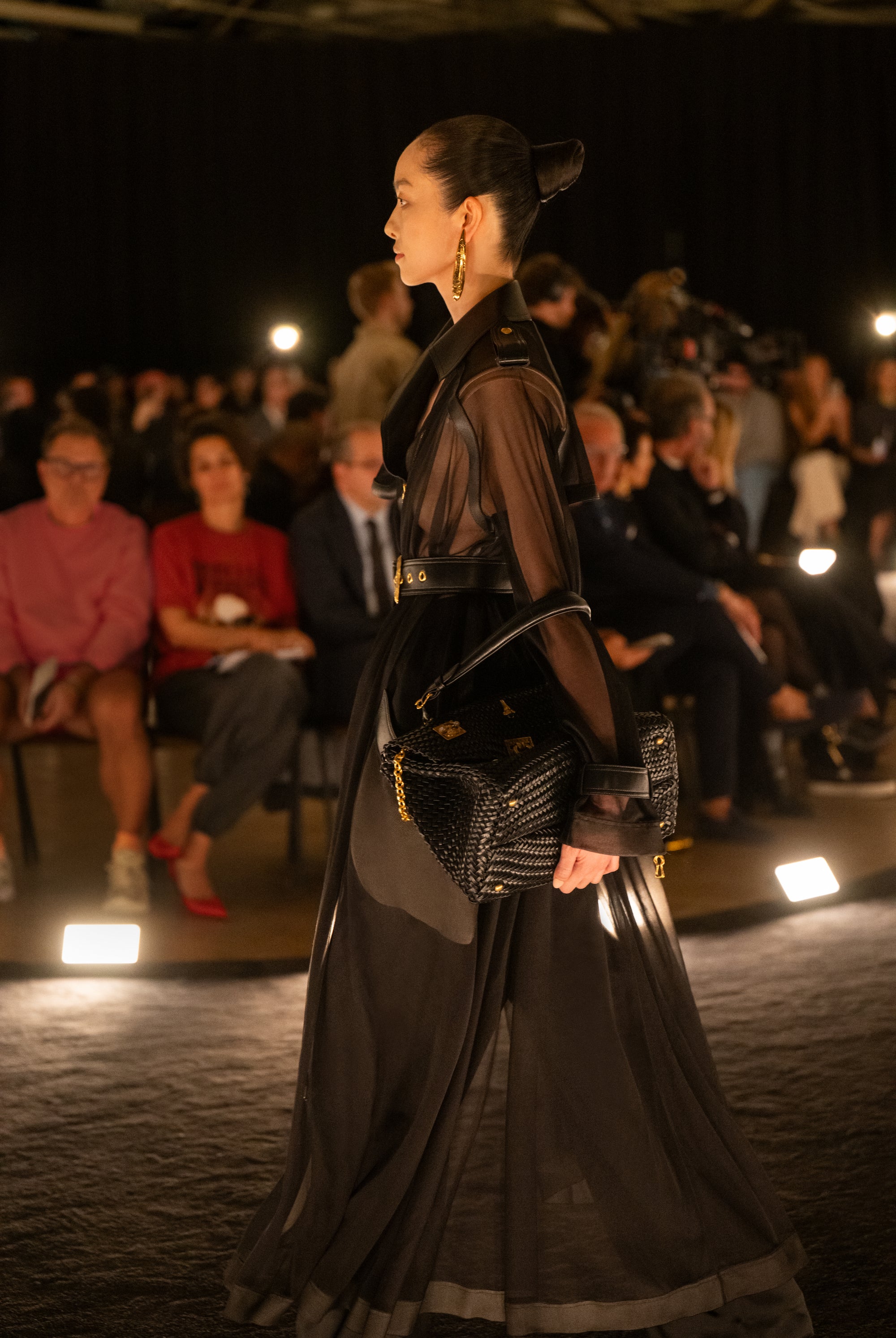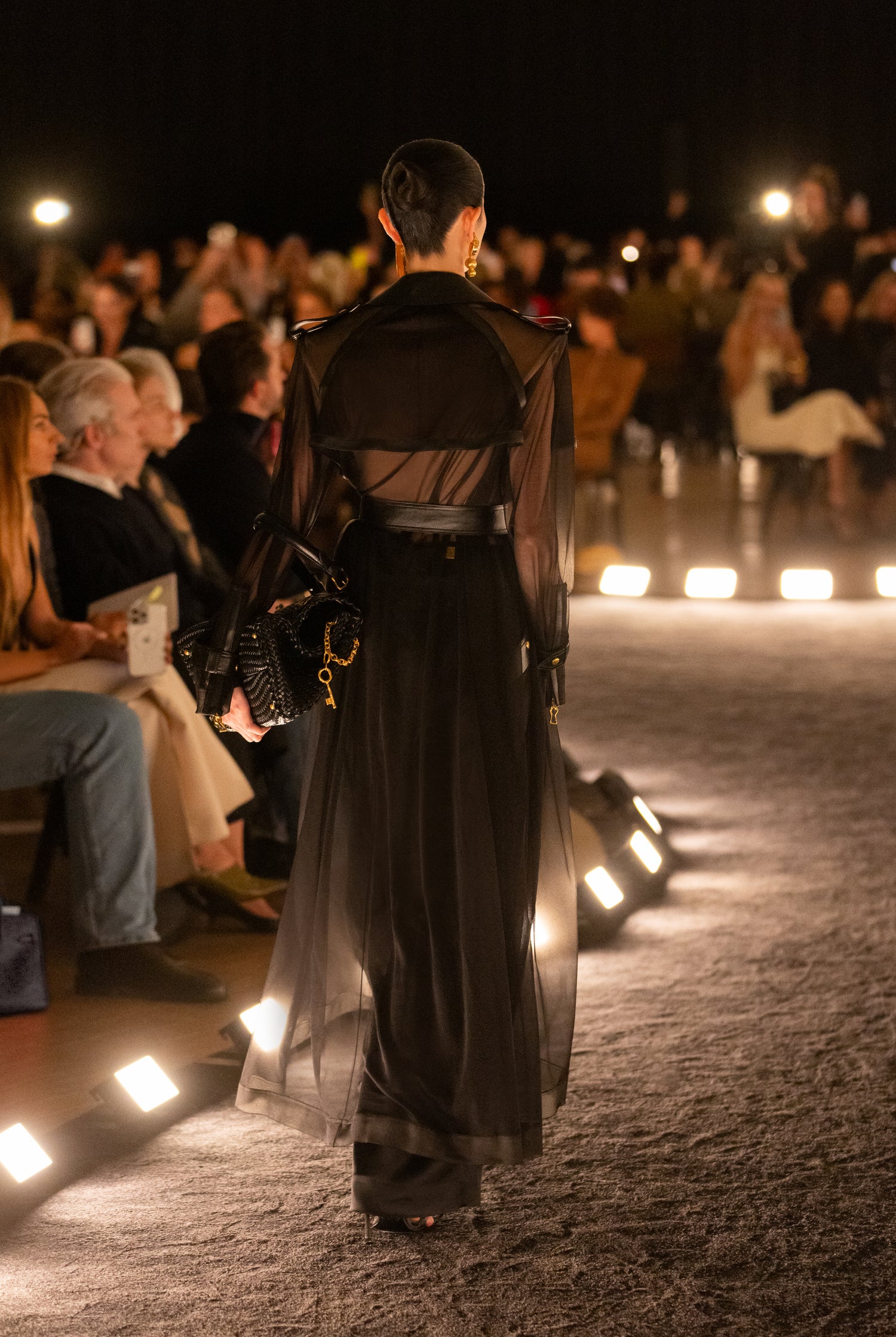 Trench en jersey transparent noir agrémenté d’empiècements en cuir d’agneau noir. Il est porté sur un pantalon oversize en satin fluide noir à pinces. Boucles d’oreilles en laiton doré dépareillées, inspirée de l’art minoen avec une gravure de la Place Vendôme pour l’une. Sandales à talons Mètre Ruban en cuir noir décorées du détail Mètre Ruban signature en métal doré.