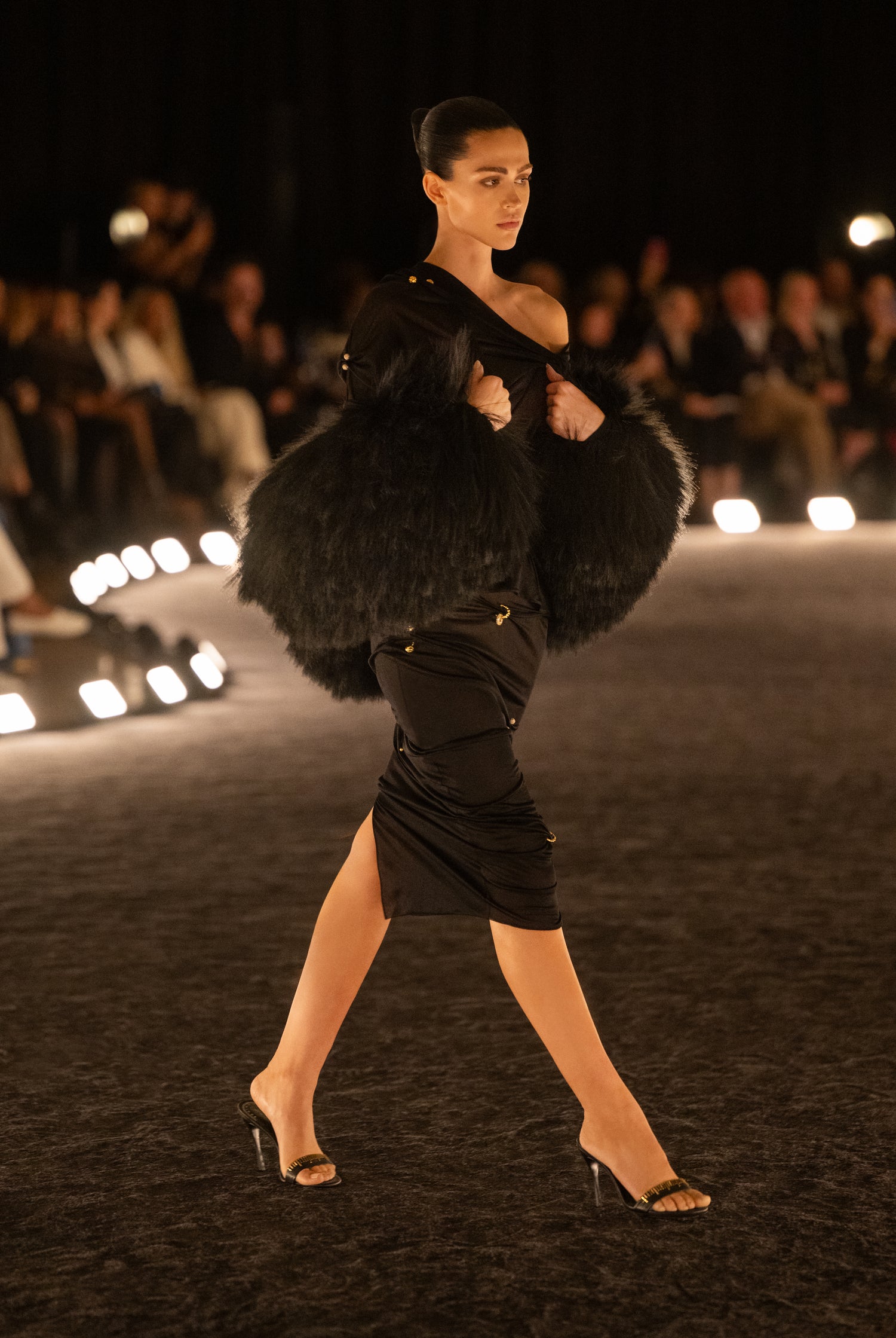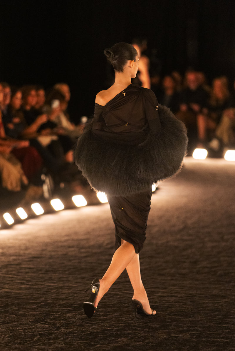 Robe asymétrique en jersey transparent noir dont le volume est drapé et ramassé par des bijoux piercing. Elle est portée sous une veste noire brodée façon « fourrure de singe ». Sandales à talons Mètre Ruban en cuir noir décorées du détail Mètre Ruban signature en métal doré.