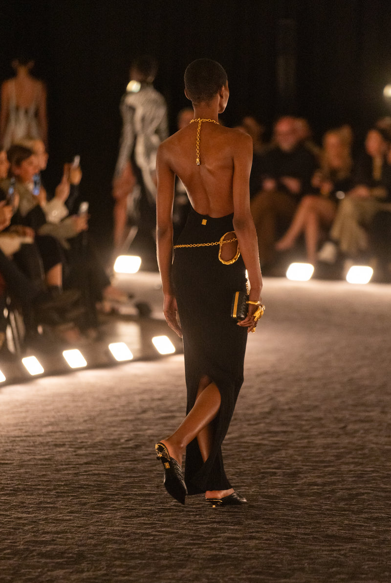 Robe longue à dos nageur en maille viscose noire effet écorce d’arbre rehaussée d’un collier bijou en laiton doré au col, de découpes irrégulières gansées de métal doré et d’une chaîne bijou dorée au dos. Pochette « main dans la main » en cuir noir tressé à la main rehaussée d’un bijou main en métal doré qui enlace les doigts. Mules sandales en cuir noir tressé à la main rehaussées d’un bijou Trou de Serrure doré au milieu et d’un petit talon évoquant le soleil.