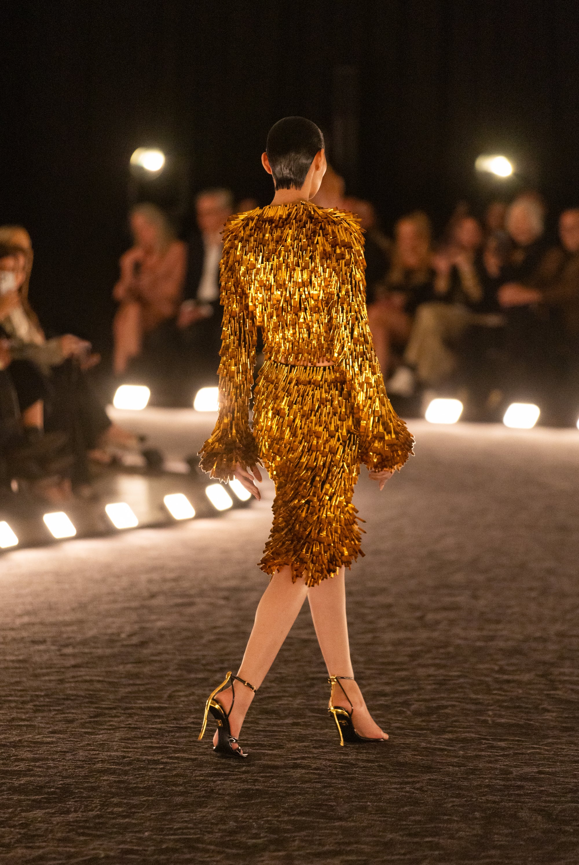 Ensemble composé d’un petit cardigan entièrement brodé de pinceaux en laiton doré et jupe crayon assortie. Sandales à bout pointu en cuir noir dotées d’un talon incurvé en métal doré finissant par une main sculptée retenant les brides.