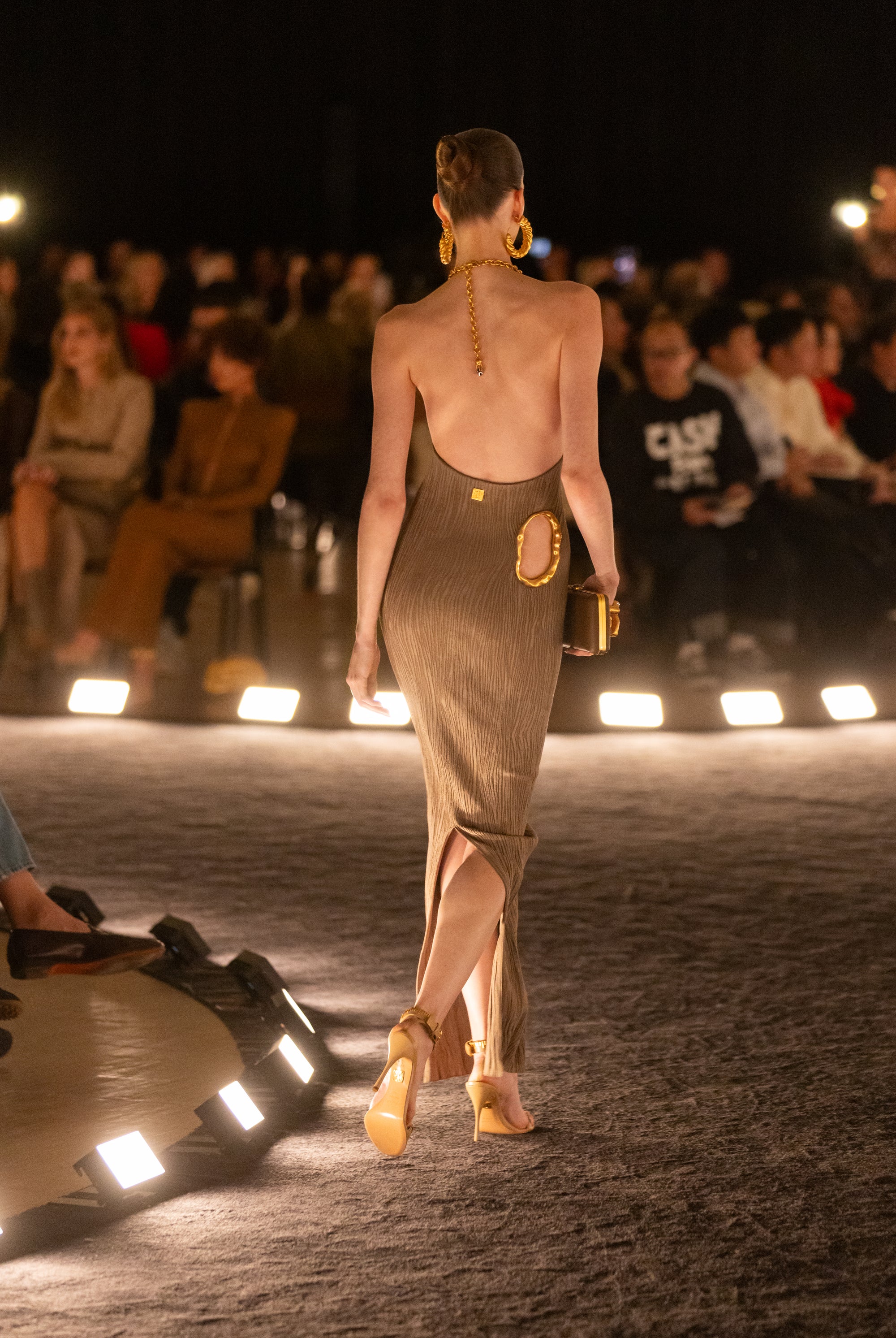 Robe longue à dos nageur tricotée en maille viscose kaki effet écorce d’arbre rehaussée d’un collier bijou en laiton doré au col, de découpes irrégulières gansées de métal doré et d’une chaîne bijou dorée au dos. Créoles twistées en laiton doré. Pochette « main dans la main » en cuir marron rehaussée d’un bijou main en métal doré qui enlace les doigts. Sandales à brides en suède taupe et bout pointu dotées d’un talon incurvé en métal doré finissant par une main sculptée.