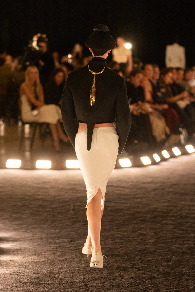 Petite veste d’inspiration matador en toile de lin noire à petit col tailleur. Sa coupe courte est agrémentée d’un volume de manche exagéré, d’un détail de laçage aux épaules et d’une queue au dos. Jupe crayon en toile chinée écrue aux poches passepoilées arrondies. Chapeau en feutre noir surmonté d’un volume 3D en satin. Bottines derby en canvas trompe l’œil en cuir blanc au détail de laçage corset et décorées d’œillets bijoux dépareillés en métal doré et strass et d’un petit talon évoquant un soleil.